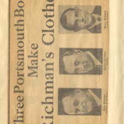 - Scanned scrapbook page showing a clipped newspaper advertisement, "Three Portsmouth Boys Make Richman's Clothes. Nate Richman, Chairman of the Board, Charlie Richman, President, Henry Richman, Secretary-Treasurer."