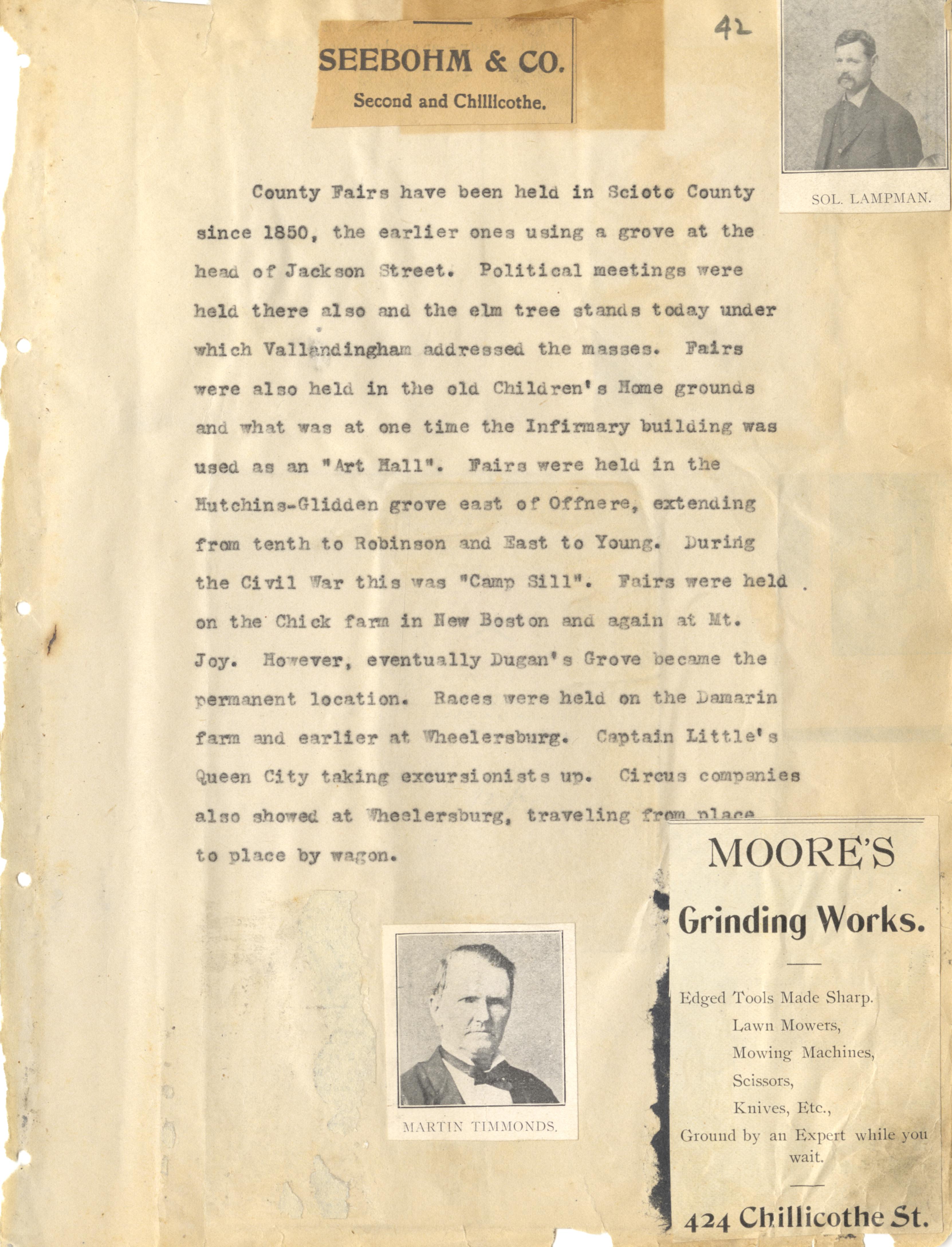 - Photo image of scanned scrapbook page 42. Seebohm & Co.; Solomon Lampman; Martin Timmonds; Moore's Grinding Works; Chillicothe Street; County Fair (1850); Children's Home; Camp Still; Mt. Joy