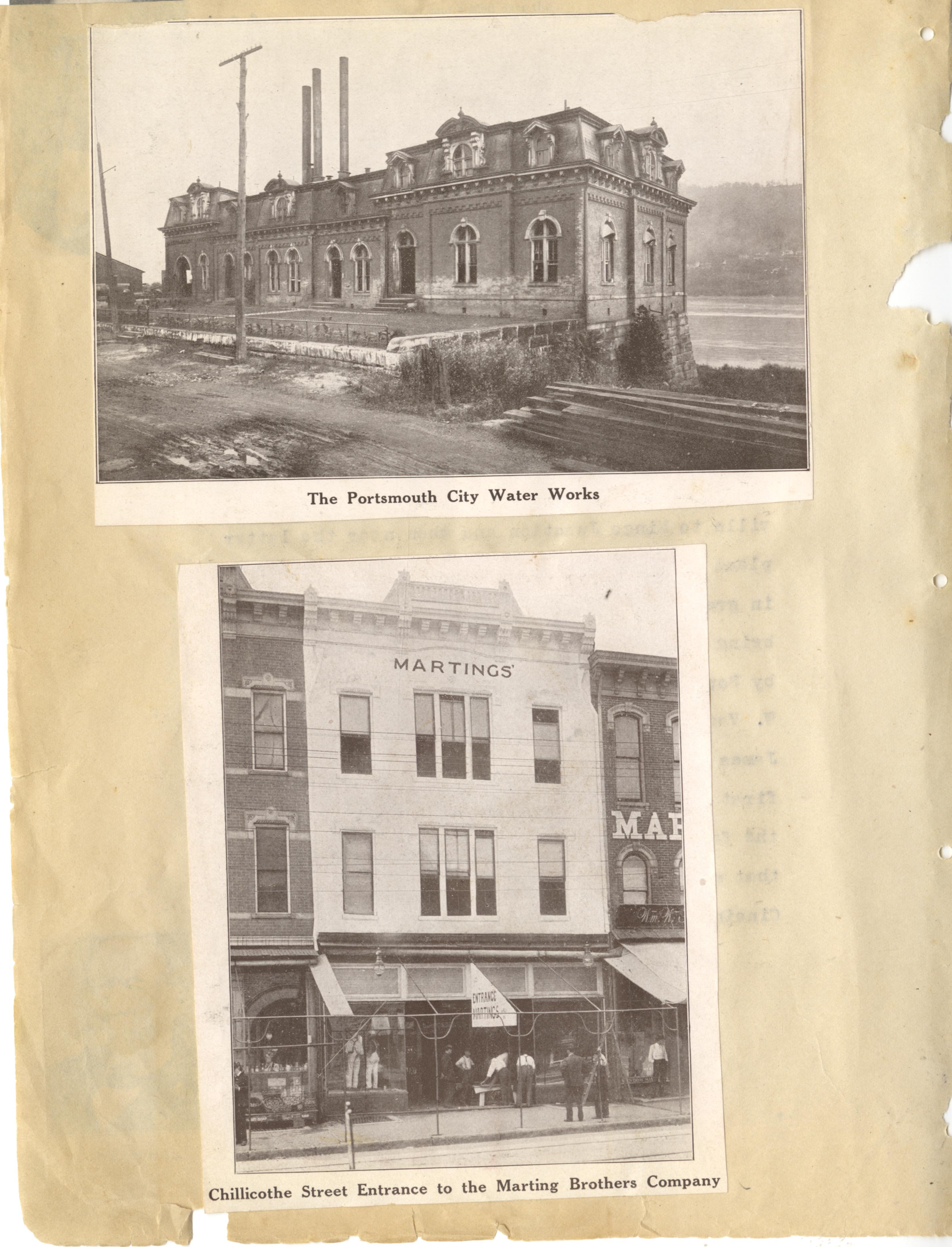 - Photo image of scanned scrapbook page. The Portsmouth City Water Works; Martings Brothers Co.; Chillicothe Street
