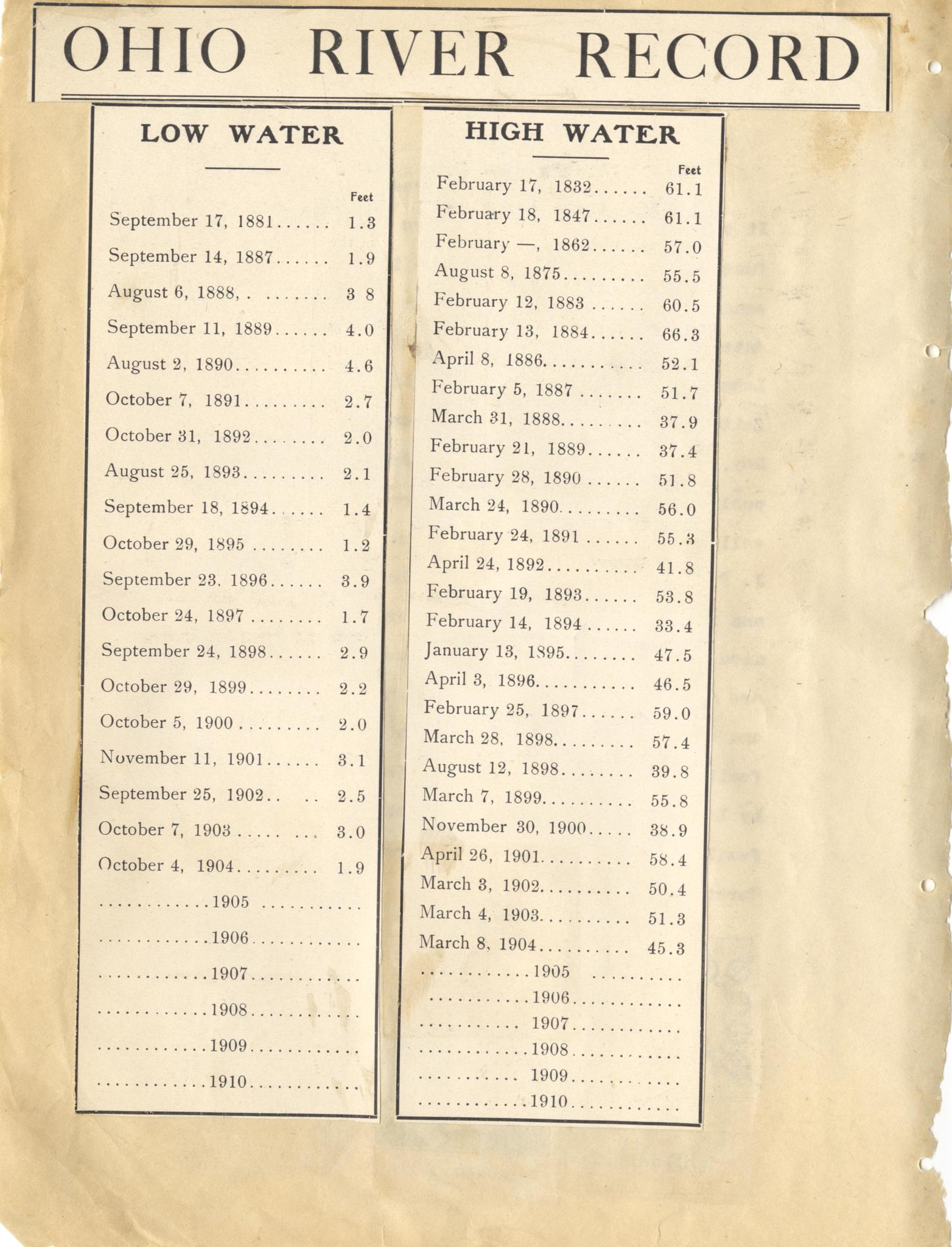 Ohio River Record; High Water; Low Water