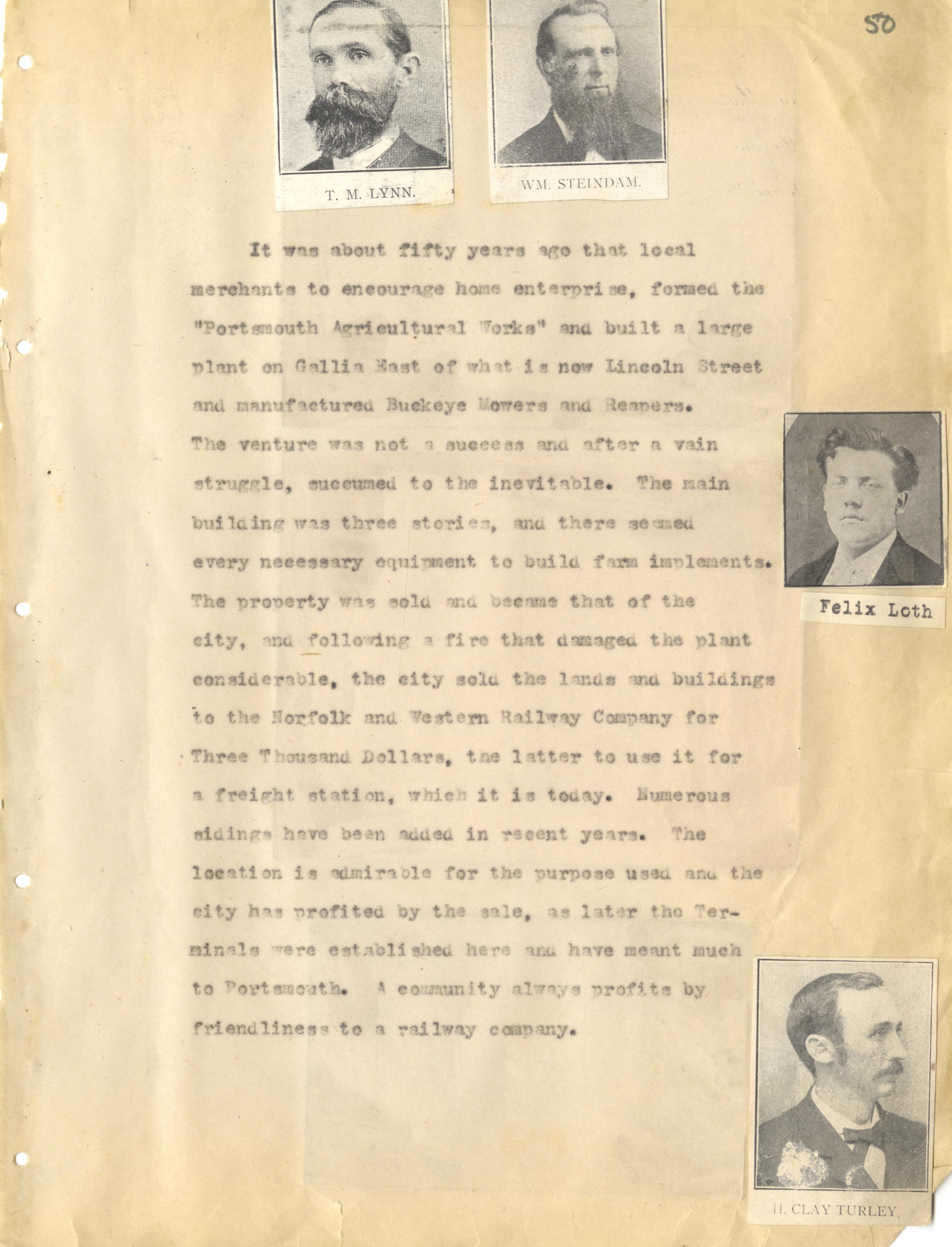 - Photo image of scanned scrapbook page 50. T. M. Lynn; William Steindam; Felix Loth; H. Clay Turley; Portsmouth Agricultural Works; Buckeye Mowers; Western Railway Company