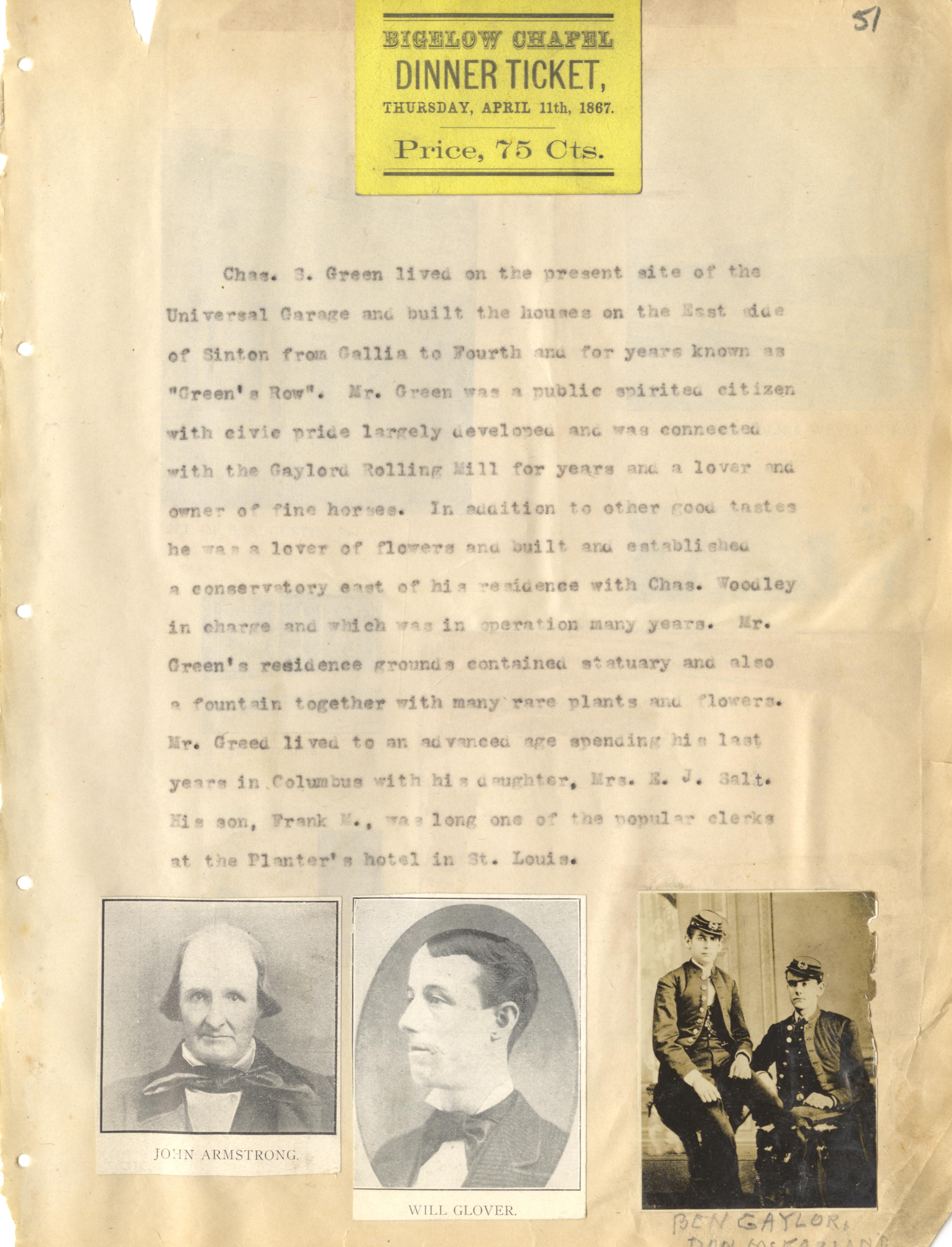 - Photo image of scanned scrapbook page 51. Bigelow Chapel (1867); Green's Row; Gaylord Rolling; Chas. Woodley; Mr. Greed; Mrs. E. J. Salt; Frank M.; John Armstrong; Will Glover; Ben Gaylord