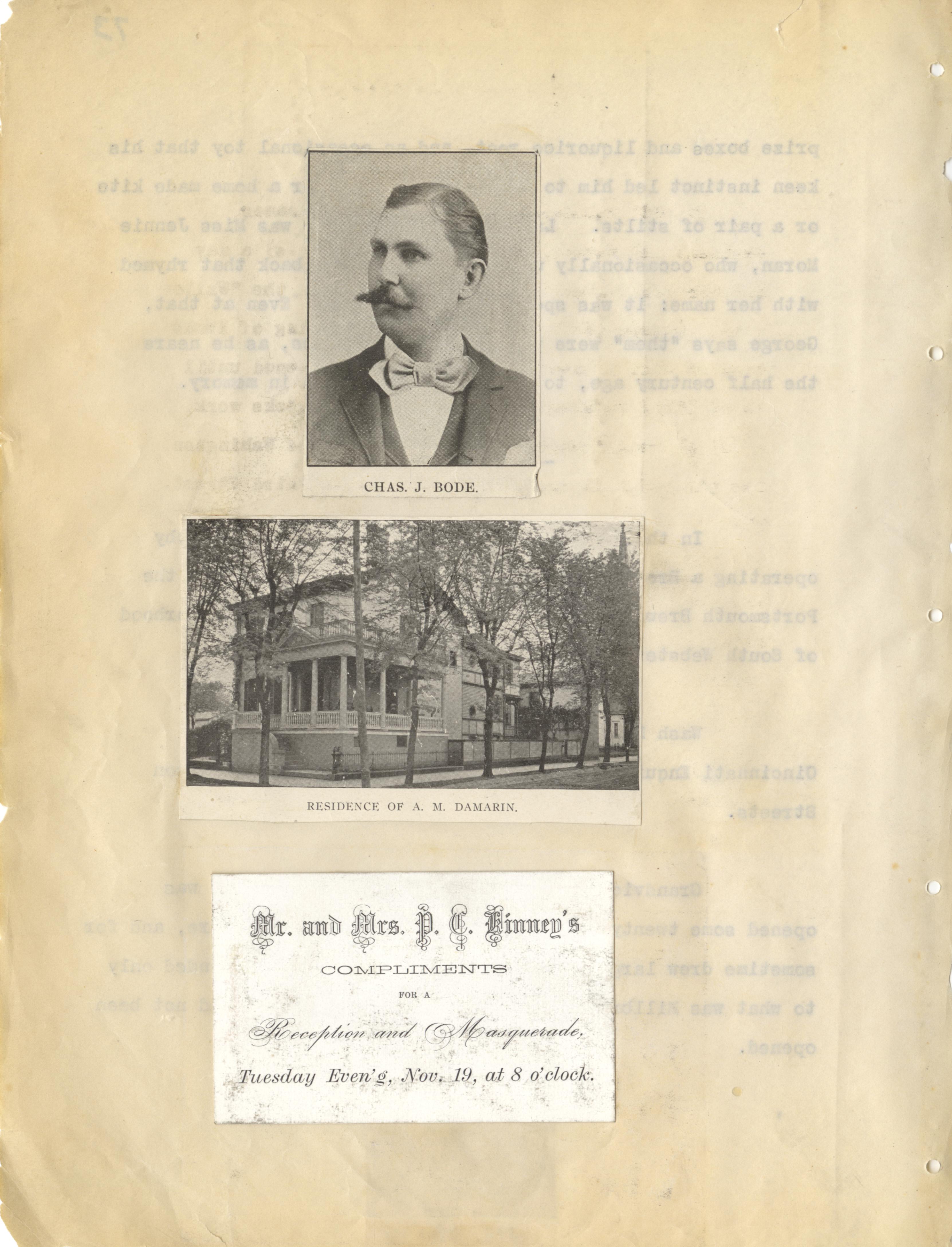 - Photo image of scanned scrapbook page. Charles J. Bode; Residence of A. M. Damarin; Mr. & Mrs. P. C. Kinney