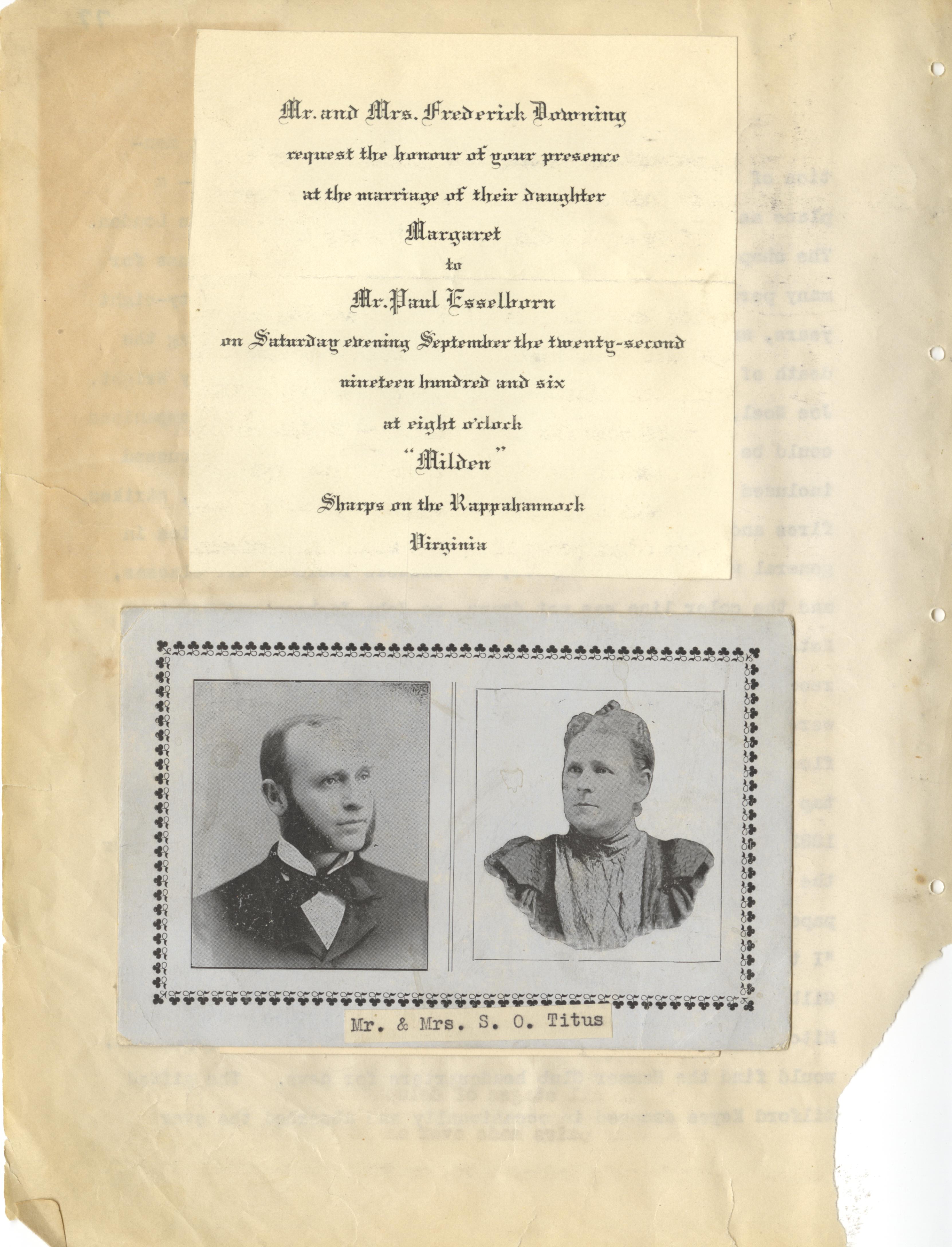 - Photo image of scanned scrapbook page. Mr. & Mrs. Frederick Downing; Margaret Downing; Paul Esselborn (September 22, 1906); Mr. & Mrs. S. O. Titus