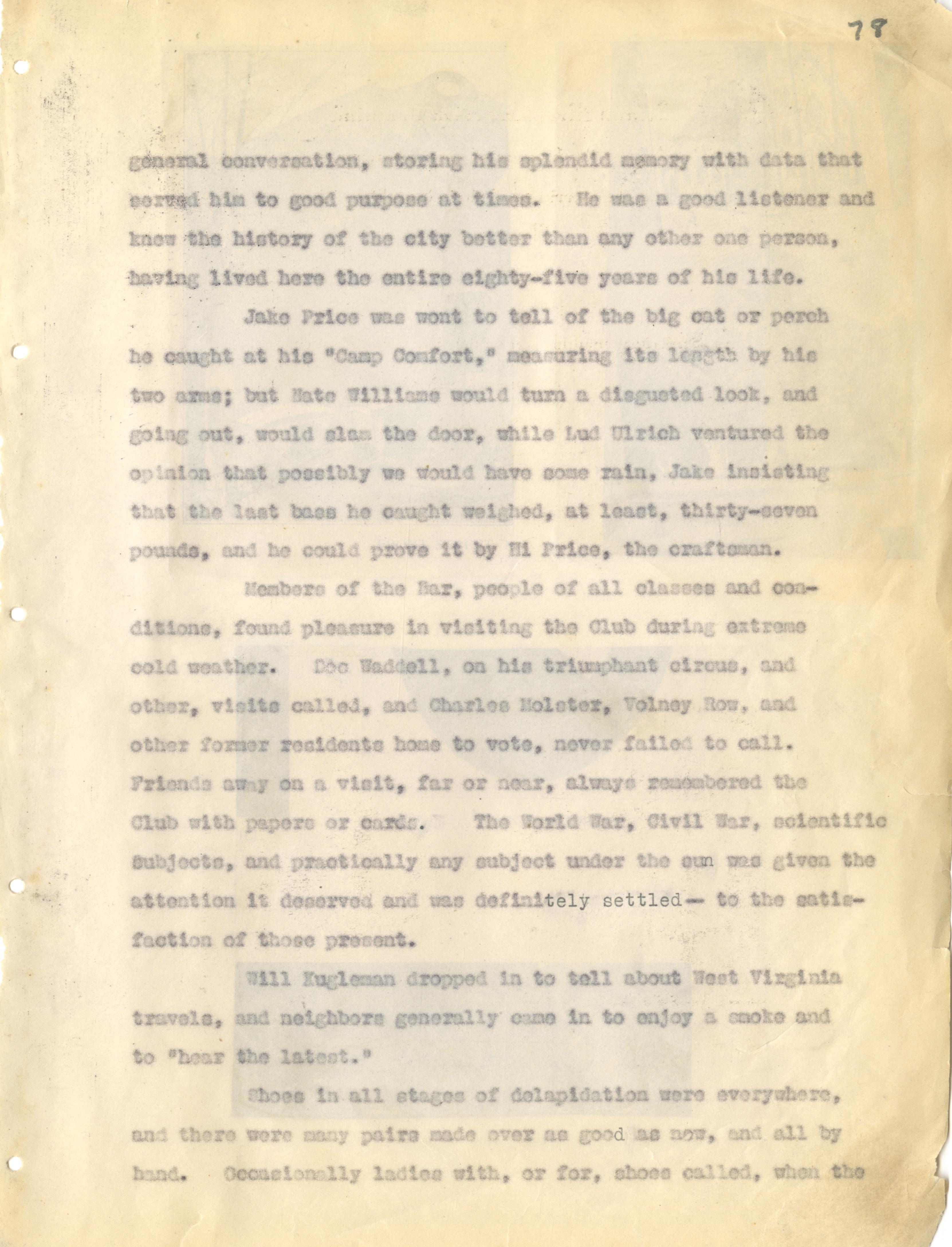- Photo image of scanned scrapbook page 78. Jake Price; Camp Comfort; Lud Ulrich; Har; Doctor Waddell; Charlee Holster; Volney Row; The World War; Civil War; Will Kugleman