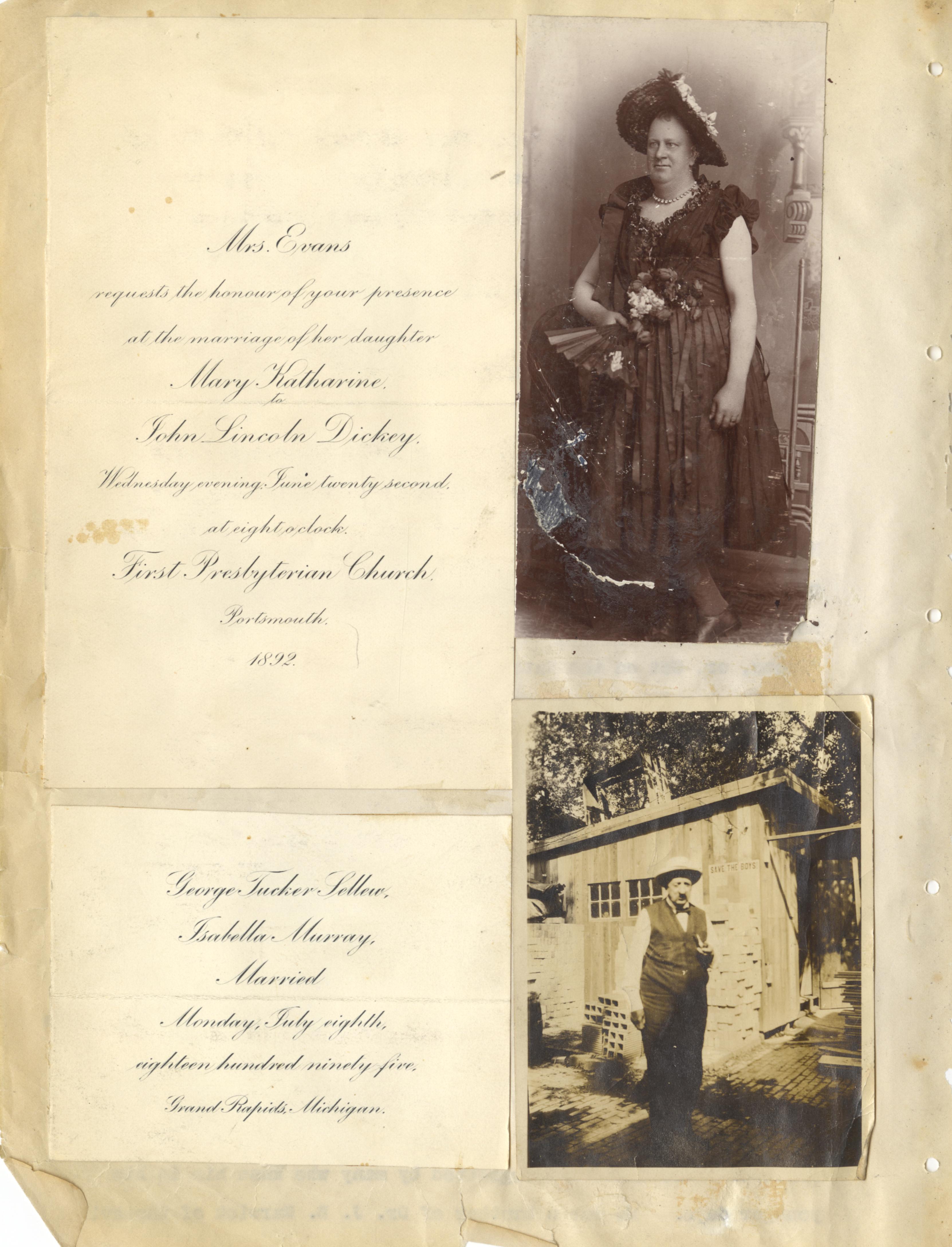 - Photo image of scanned scrapbook page. Mrs. Evans; Mary Katharine; John Lincoln Dickey (June 22, 1892); George Tucker Sellew; Isabella Murray (July 18, 1895)