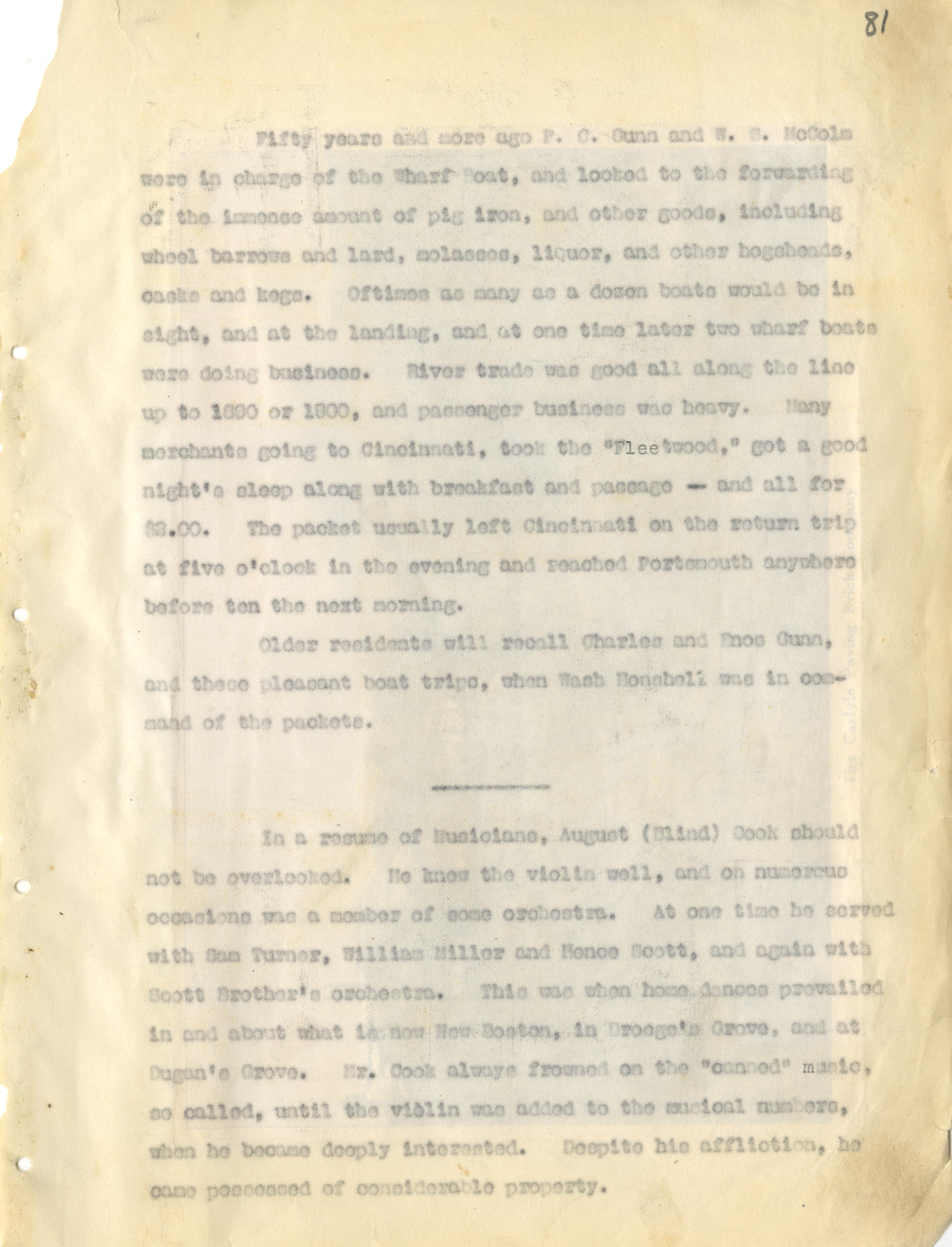 Henry A. Lorberg, “P. C. Gunn; W. S. McGolm; River Trade; Fleetwood; Sam Turner; August Cook; William Miller; Renee; Dugan's Grove,” Scioto County Public Library Local History Digital Collection, accessed December 14, 2025, https://www.sciotolibrary.org/history/items/show/24506.