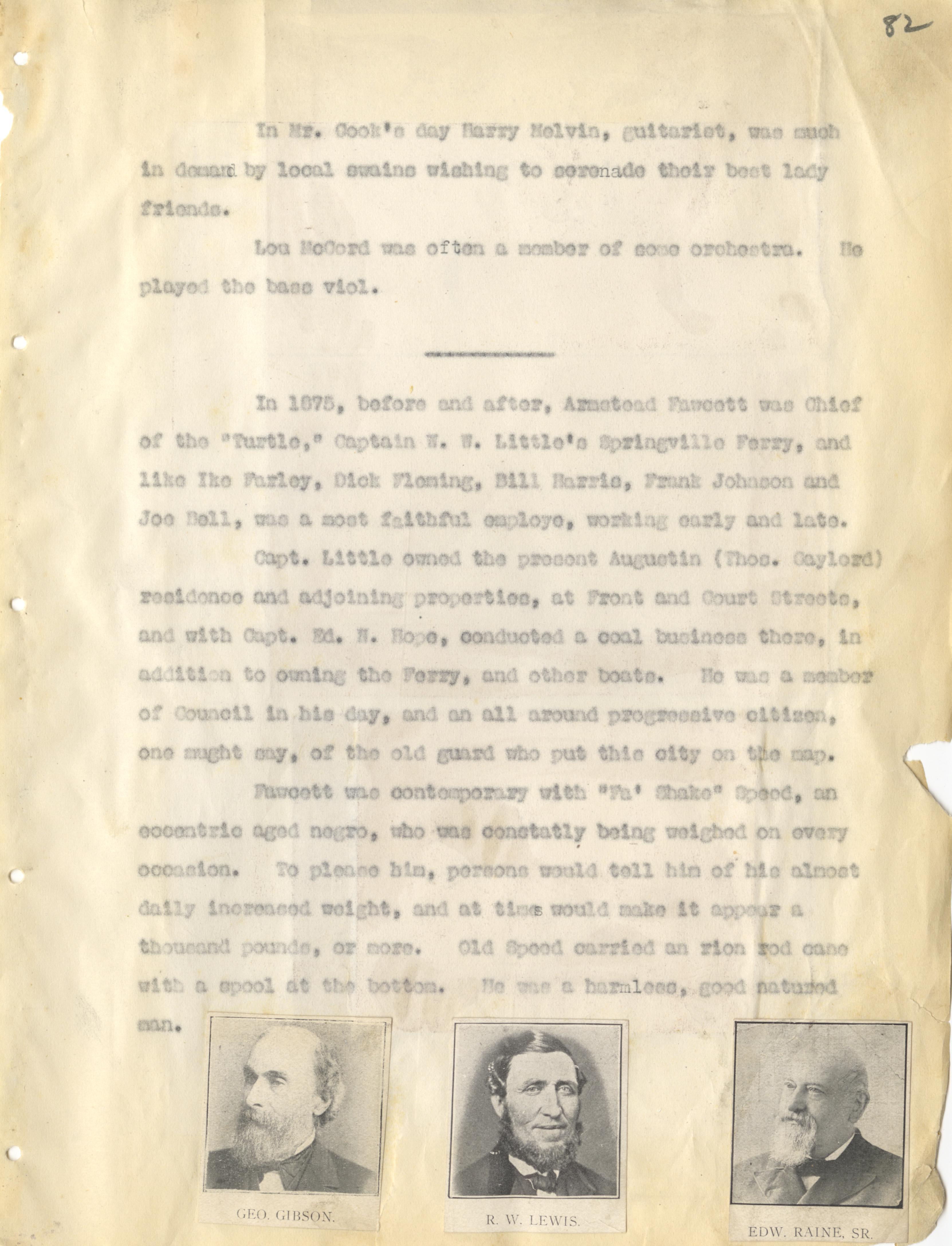 - Photo image of scanned scrapbook page 82. Harry Melvin; Lou McCord; Captain W. W. Little's Springville Ferry (1875); Ike Farley; Dick Floming; Bill Rarrie; Frank Johnson; Joe Bell; George Gibson; R. W. Lewis; Edward Raine Sr.