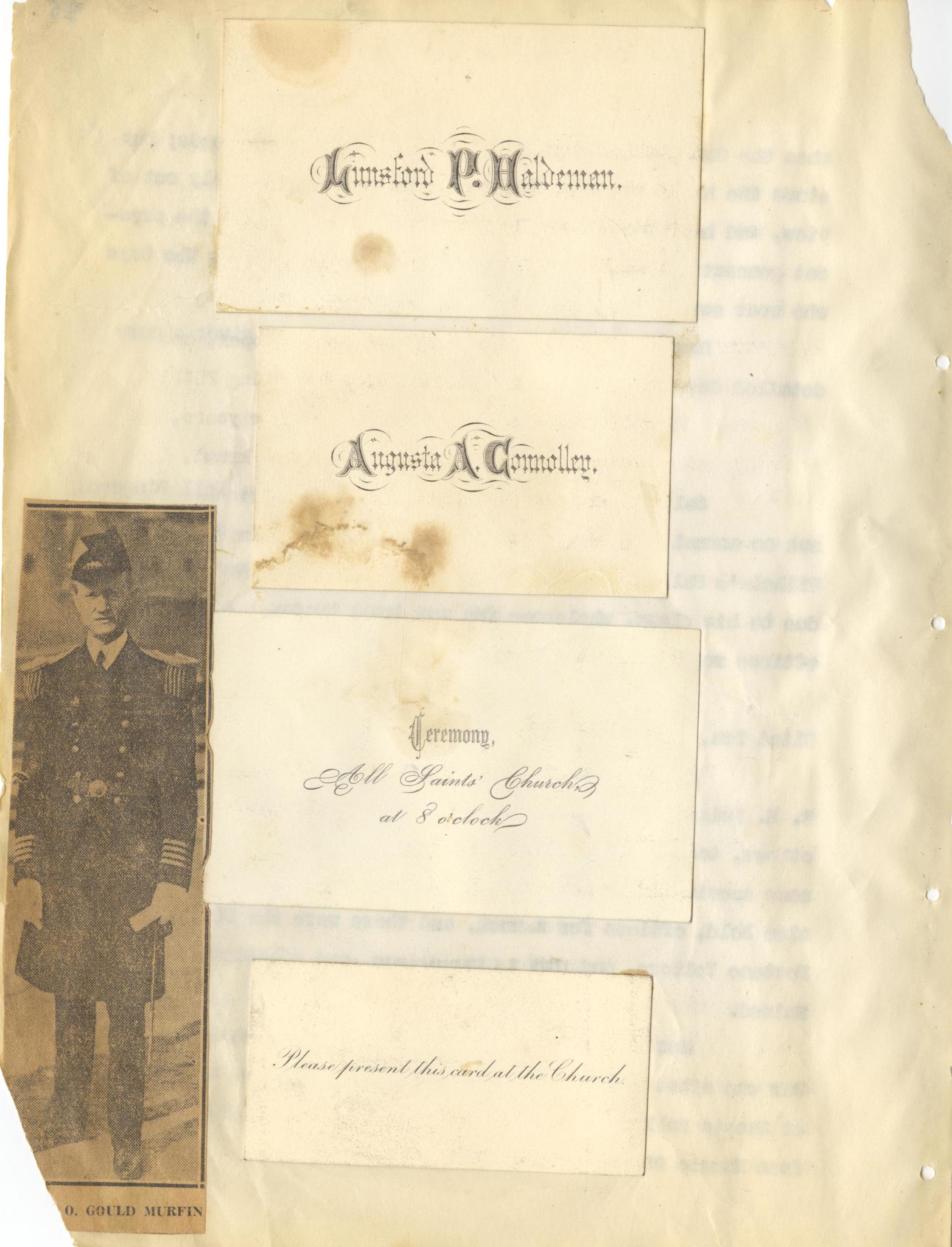 - Photo image of scanned scrapbook page. Mimsford P. Haldeman; Augusta A. Gonnolley; All Saints' Church; Gould Murfin
