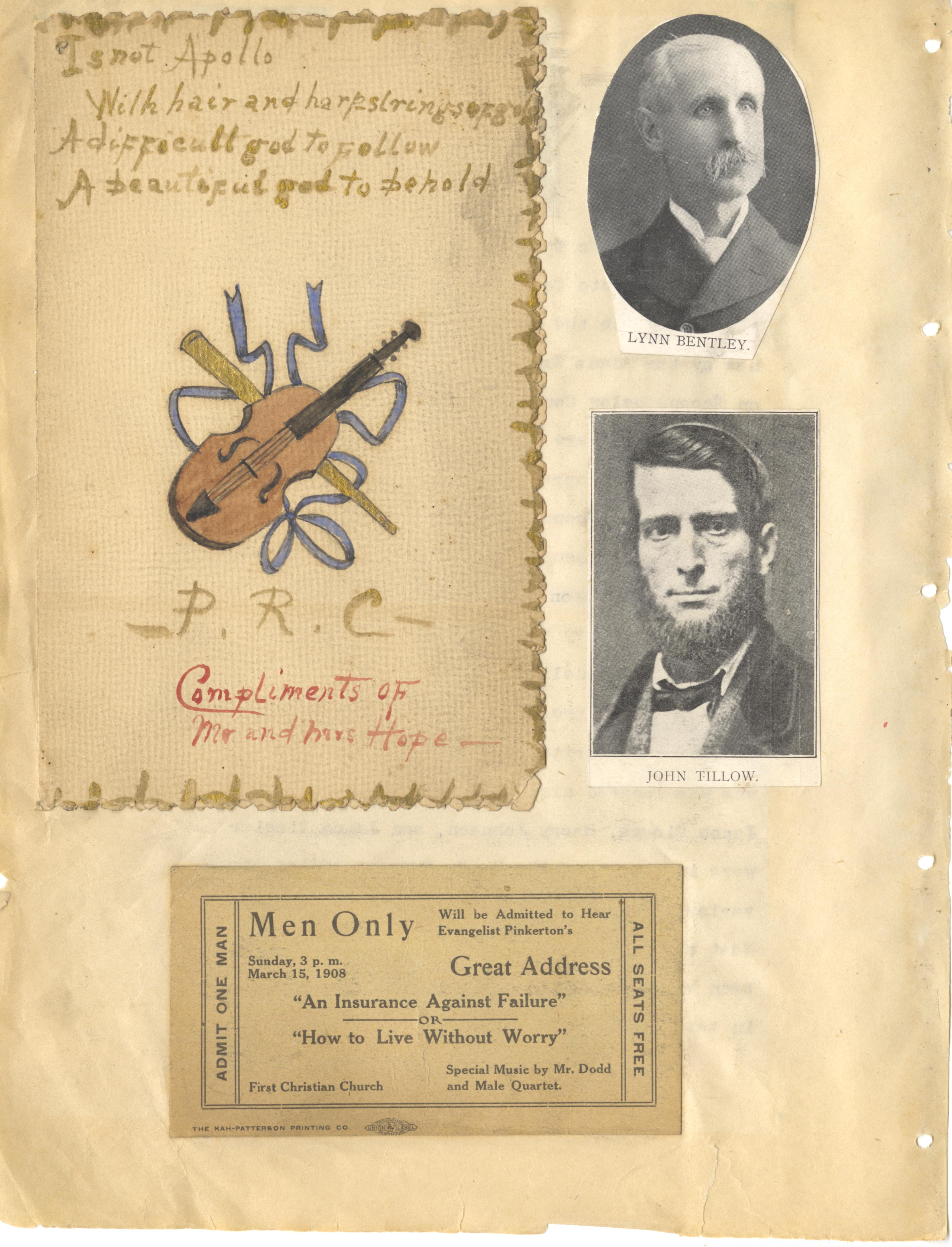 - Photo image of scanned scrapbook page. P. R. C.; Compliments of Mr. and Mrs. Hope; Lynn Bentley; John Tillow; An Insurance Against Failure (1908); How to Live Without Worry (1908); Ticket