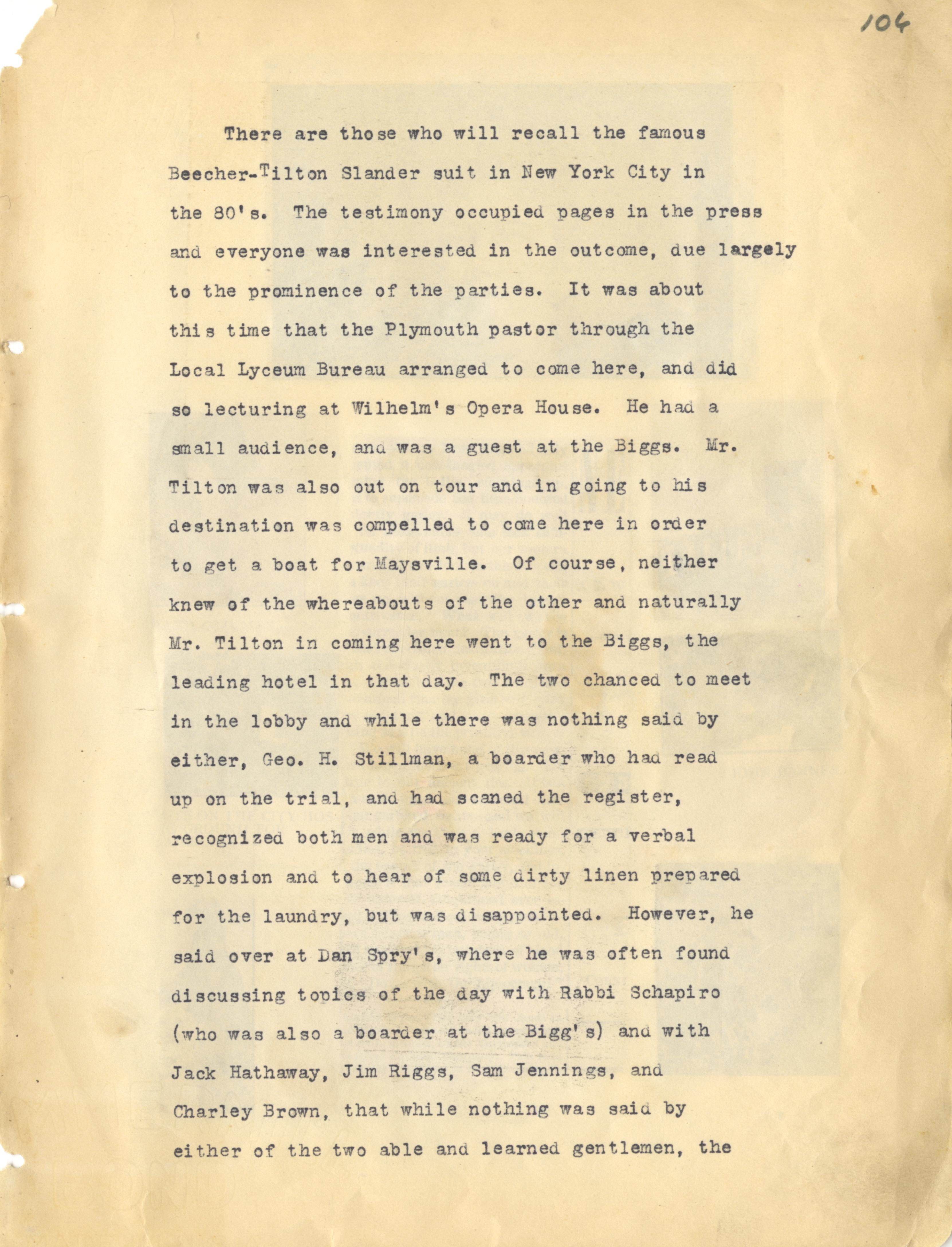 - Beecher- Tilton Slander (1880s); Lyceum Bureau; Wilhelm's Opera House; Biggs; George H. Stillman; Dan Spry; Rabbi Schapiro; Jack Hathaway; Jim Riggs; Sam Jennings; Charley Brown