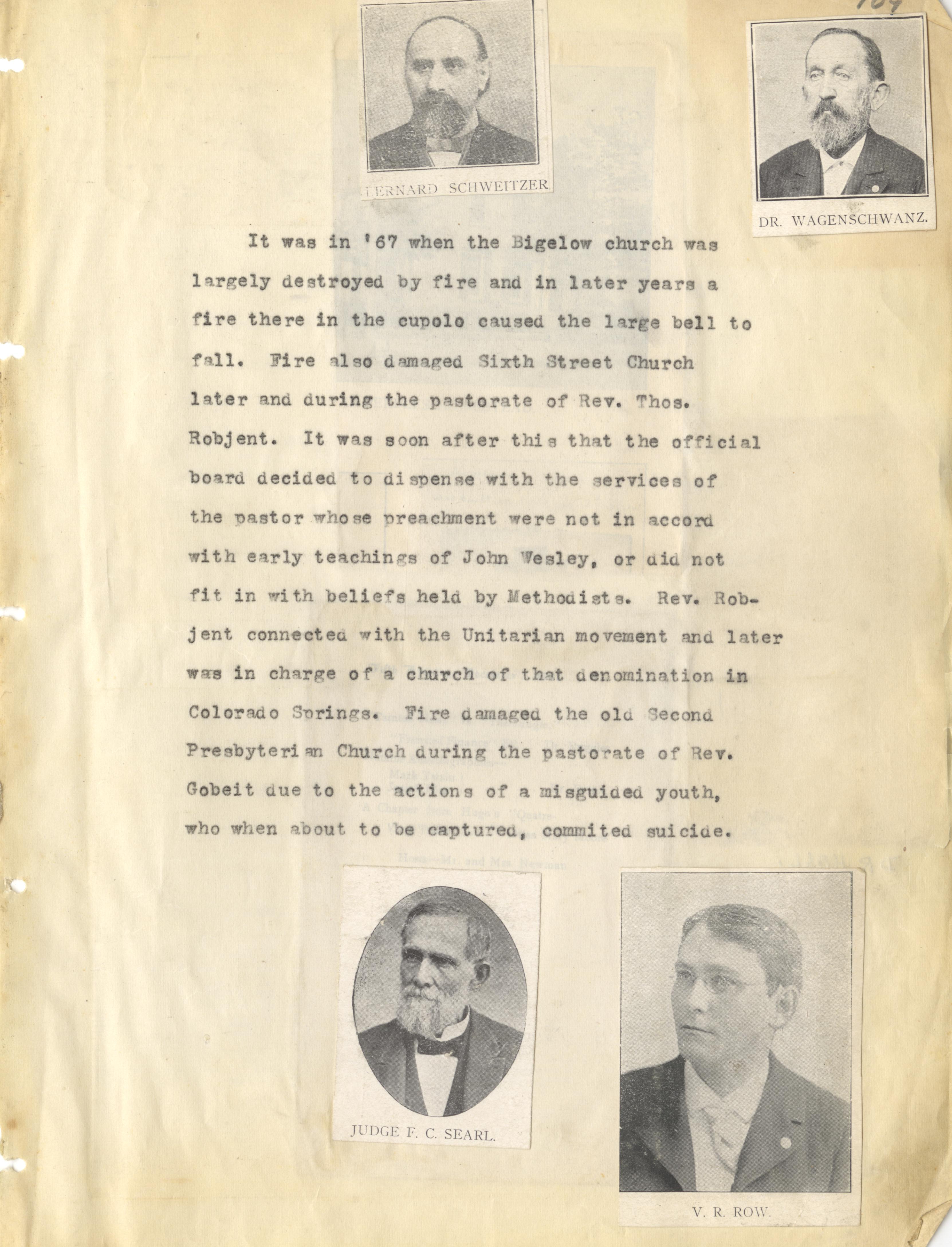 - Photo image of scanned scrapbook page 109. Bernard Schweitzer; Dr. Wagenschwanz; Judge F. C. Searl; V. R. Row; Bigelow Church Fire (1867); Sixth (6th) Street Church; John Wesley; Rev. Thomas Robjent; Colorado Springs; Second Presbyterian Church; Rev. Gobeit