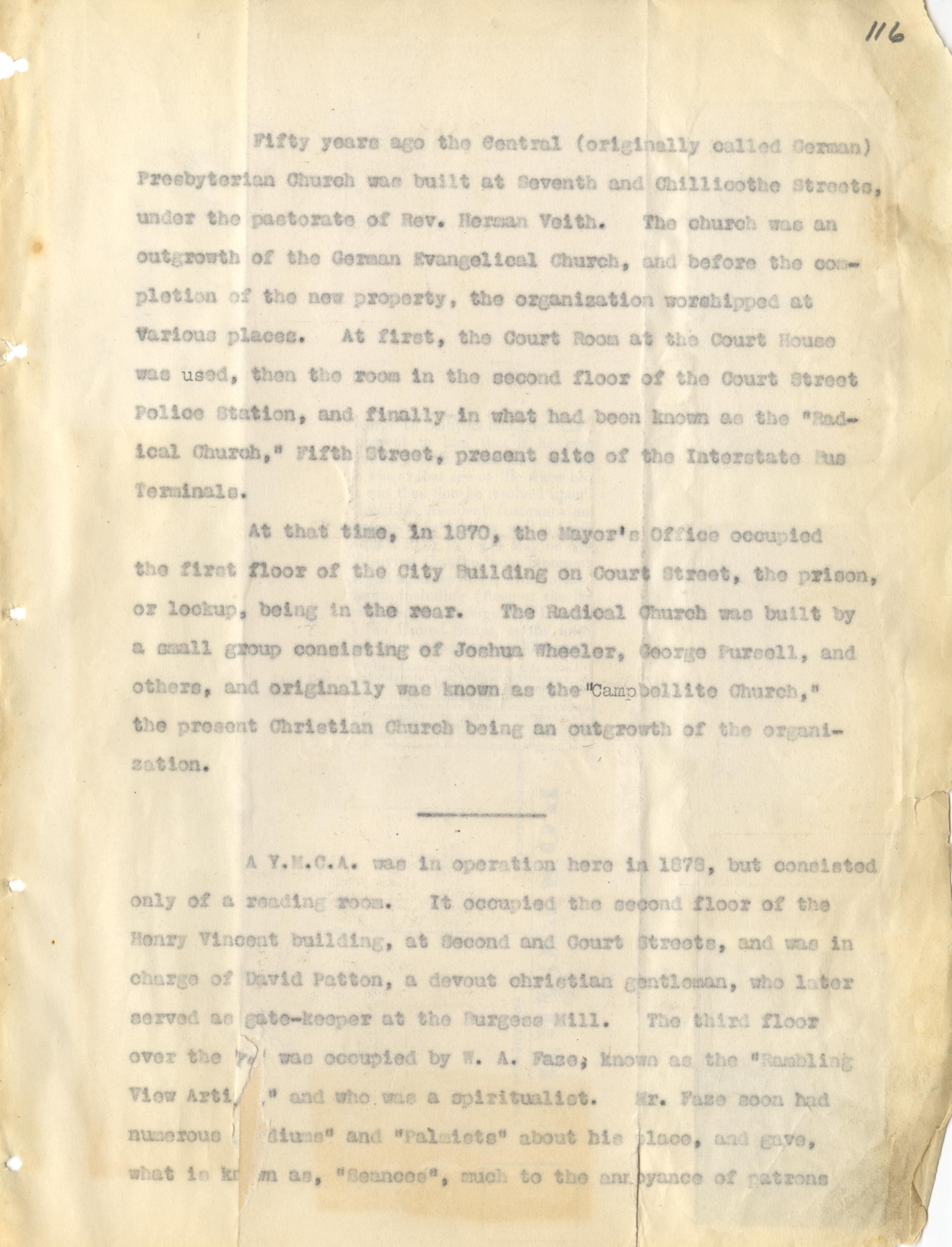 - Photo image of scanned scrapbook page 116. Central (German) Presbyterian Church; Rev. Herman Veith; German Evangelical Church; Police Station; "Radical Church"; Mayor's Office (1870); Joshua Wheeler; George Pursell; Campbellite Church; Y. M. C. A. (1878); Henry Vincent Building; David Patton; Burgess Hill; W. A. Faze