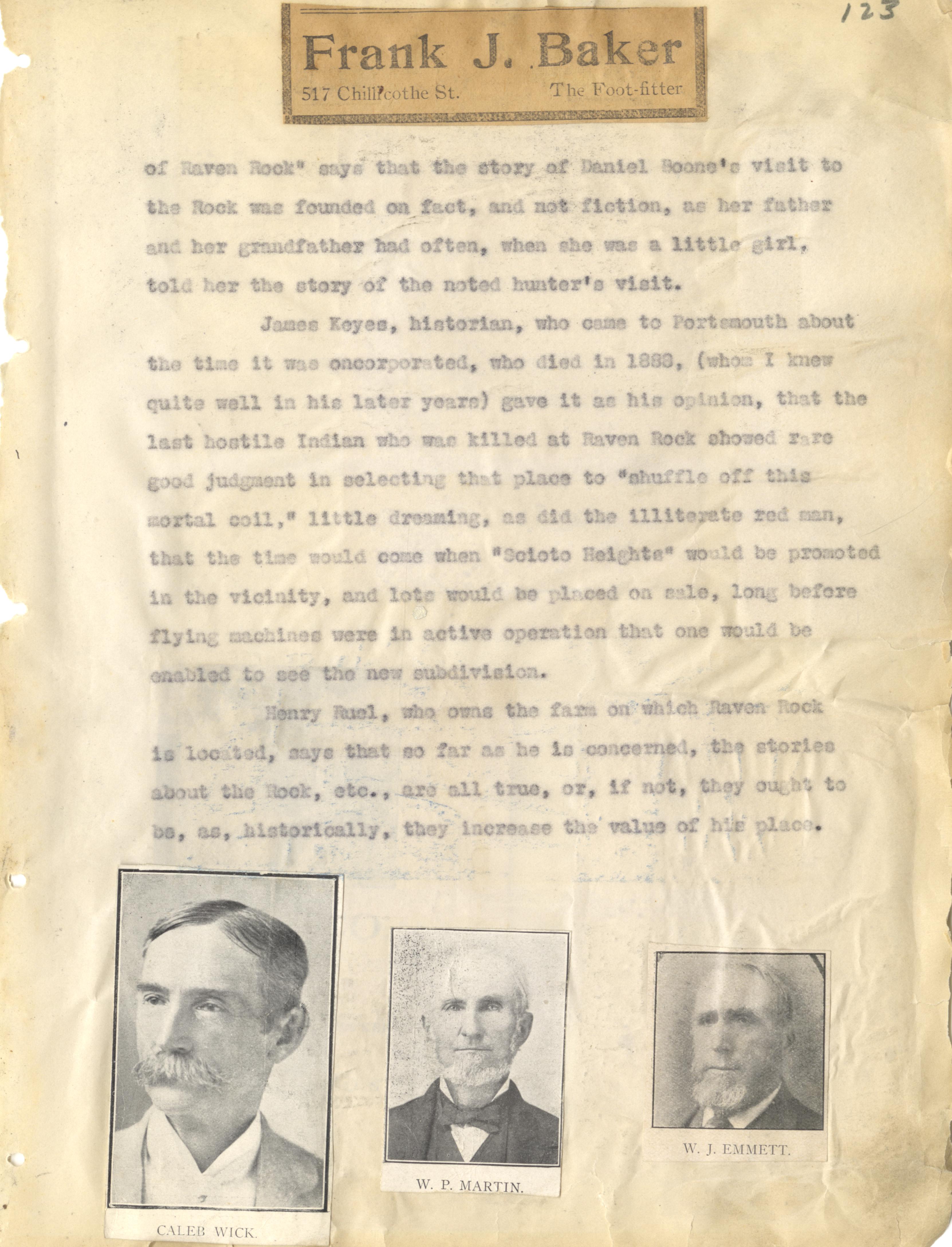 - Photo image of scanned scrapbook page 123. Raven Rock; Daniel Boone; James Keyes (1888); Indian; Scioto Heights; Henry Ruel; Caleb Wick; W. P. Martin; W. J. Emmett; Frank J. Baker