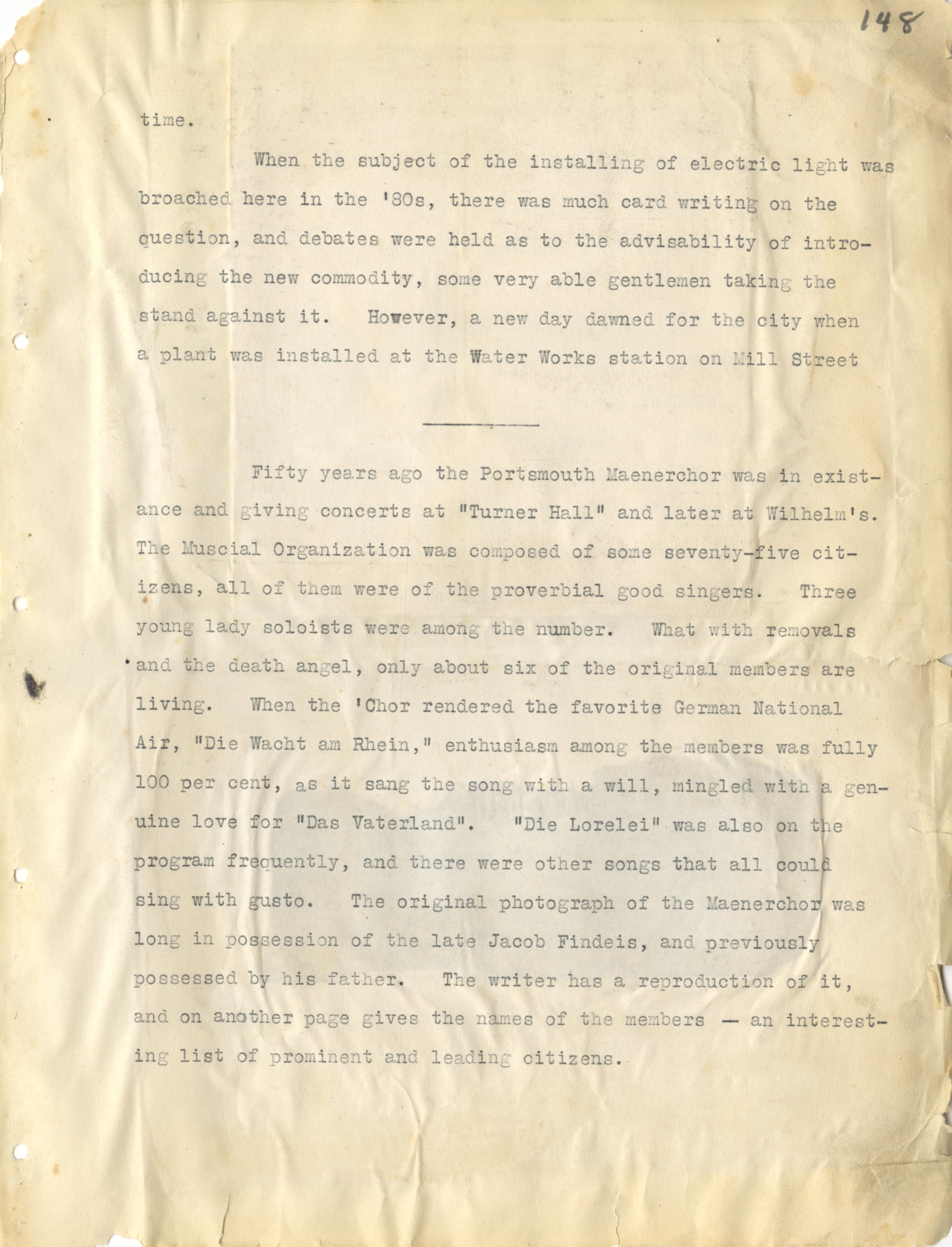 - Photo image of scanned scrapbook page 148. Typewritten information for Electric Light (1880s); Water Works Station; Mill Street; Portsmouth Maenerchor; Turner Hall; Wilhelm's; The Musical Organization; German Nation Air; Die Wacht Am Rhein; Das Vaterland; Die Lorelei; Jacob Findeis