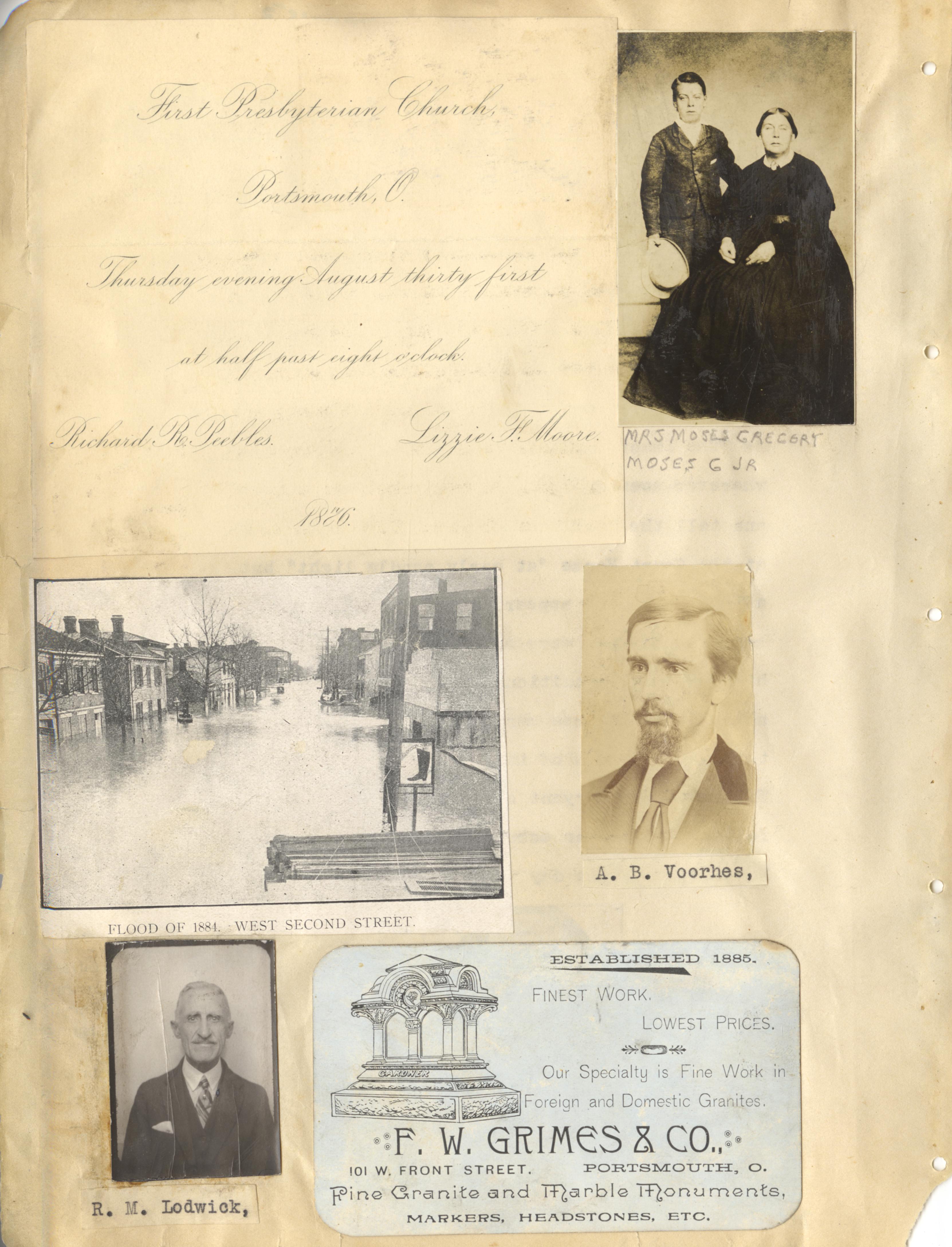 Henry A. Lorberg, “First Presbyterian Church; Richard R. Peebles; Lizzie F. Moore; Marriage (1876); Mrs. Moses Gregory; Moses G. Jr.; Flood of 1884; West Second (2nd) Street; A. B. Voorhes; R. M. Lodwick; F. W. Grimes & Co. (1885),” Scioto County Public Library Local History Digital Collection, accessed December 13, 2025, https://www.sciotolibrary.org/history/items/show/24645.