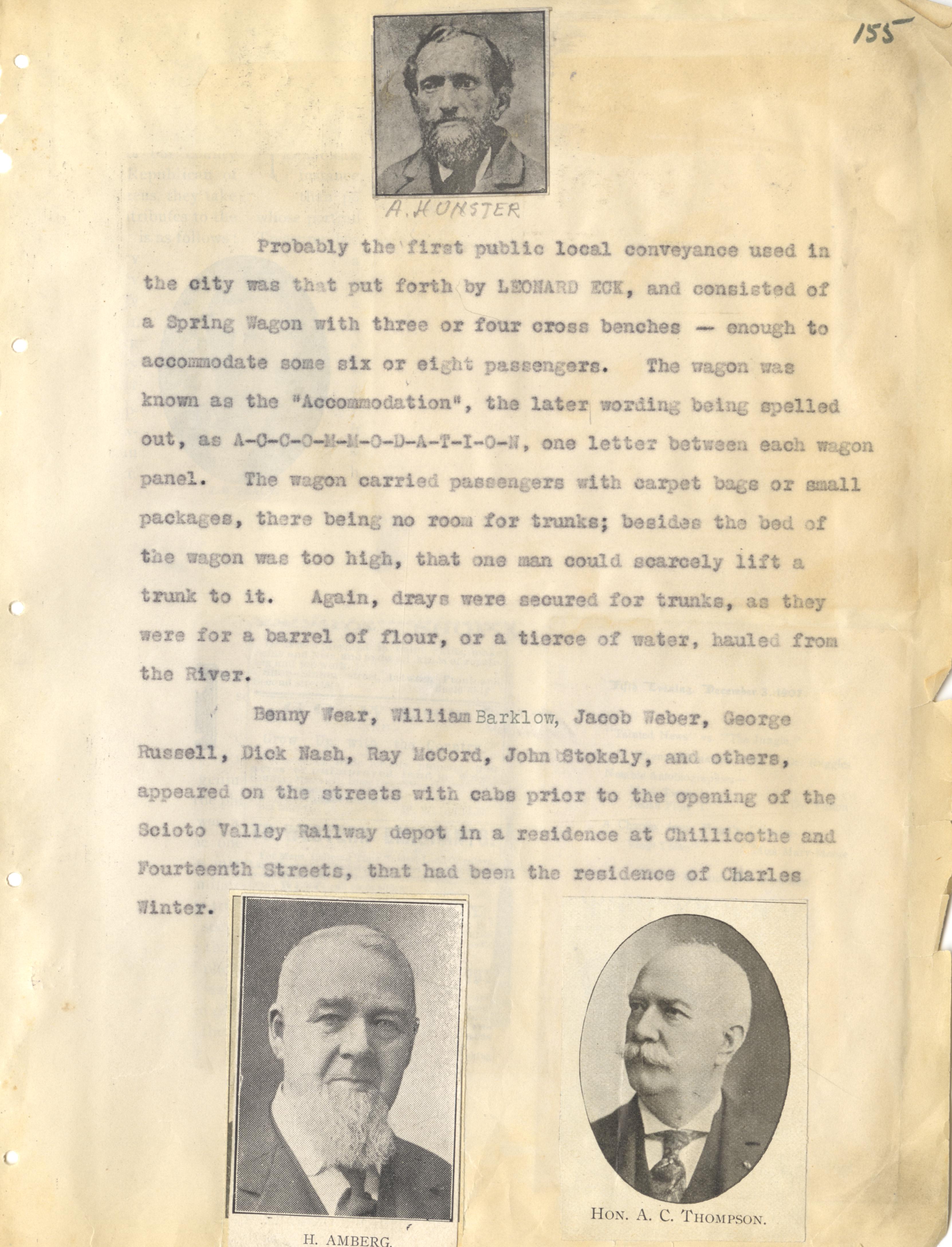 - Photo image of scanned scrapbook page 155. A. Hunster; Leonard Eck; Local Conveyance; Benny Wear; William Barklow; Jacob Weber; George Russell; Dick Nash; Ray McCord; John Stokely; Scioto Valley Railway; Charles Winter; H. Amberg; Hon. A. C. Thompson