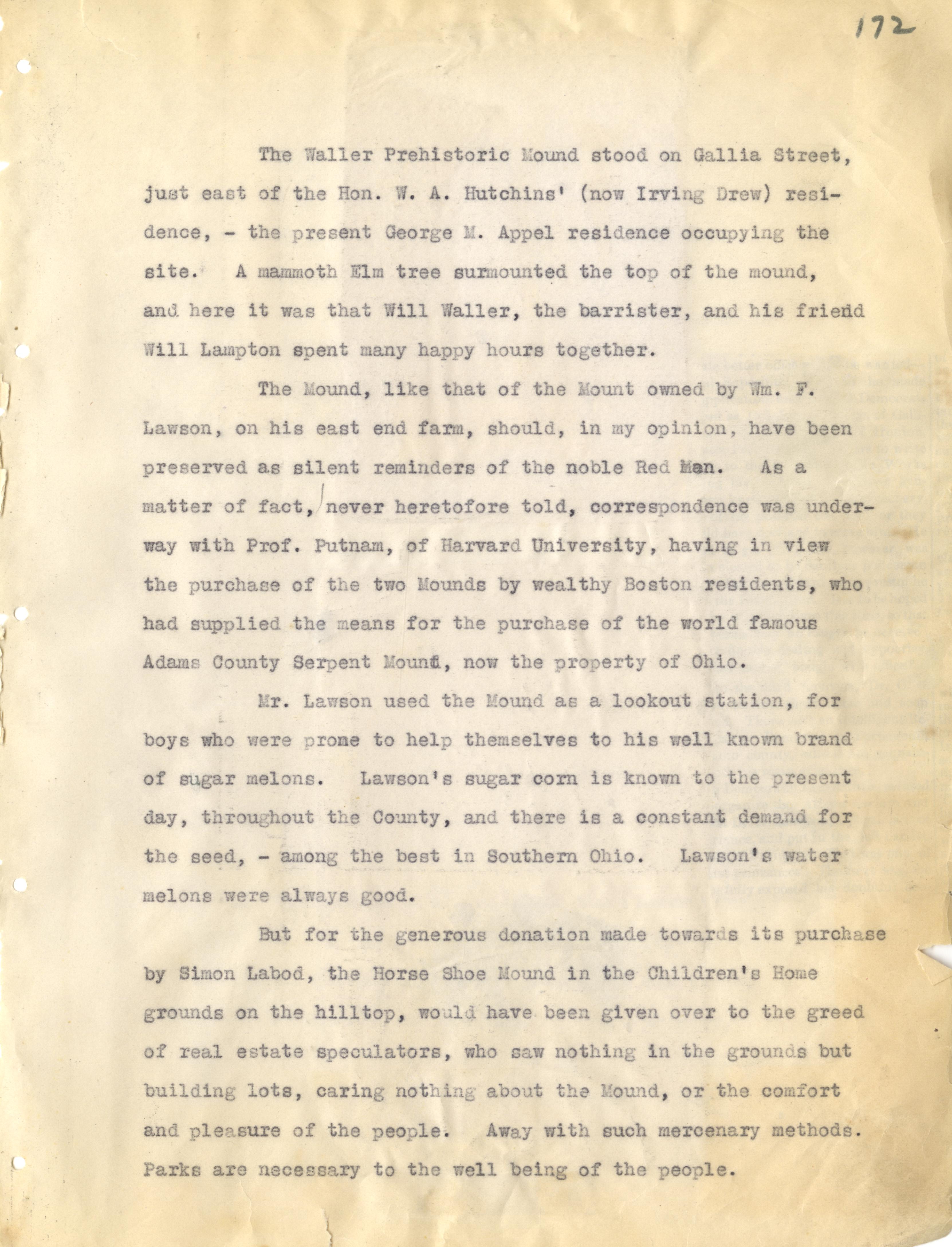 - Photo image of scanned scrapbook page 172. Waller Prehistoric Mound; Gallia Street; Hon. W. A. Hutchins; Irving Drew; George M. Appel; Will Walker; William F. Lawson; Red Men; Prof. Putman; Harvard University; Adams County; Serpent Mount; Simon Labod; Horse Shoe Mound; Children's Home