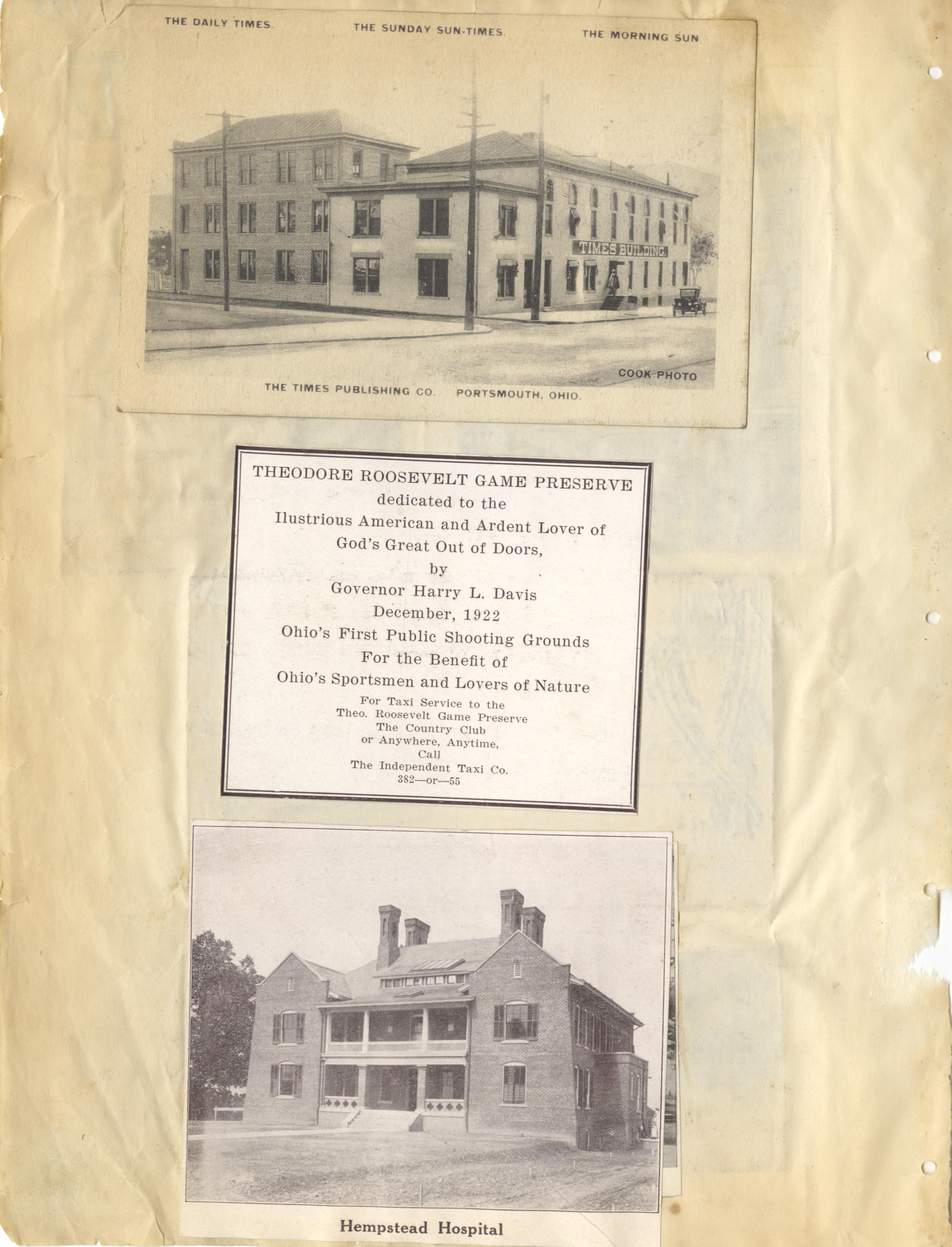 Henry A. Lorberg, “The Daily Times; The Sunday Sun- Times; The Morning Sun; The Times Publishing Company; Cook Photo; Theodore Roosevelt Game Preserve; Harry L. Davis; Ohio's First Public Shooting Grounds (1922); Hempstead Hospital,” Scioto County Public Library Local History Digital Collection, accessed December 8, 2025, https://www.sciotolibrary.org/history/items/show/24689.