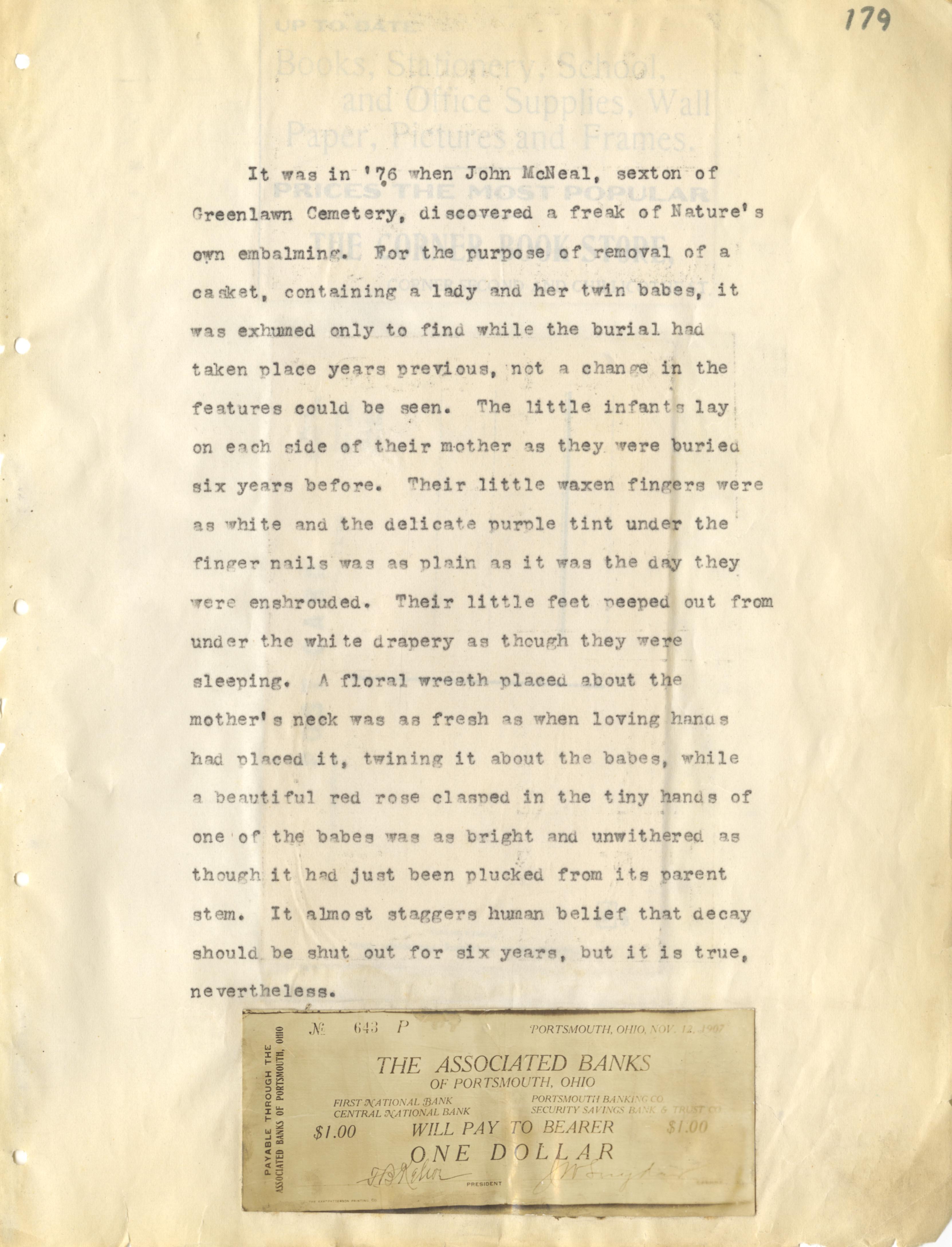 - Photo image of scanned scrapbook page 179. John McNeal (1876); Sexton; Greenlawn Cemetery; Embalming; The Associated Banks (1907)