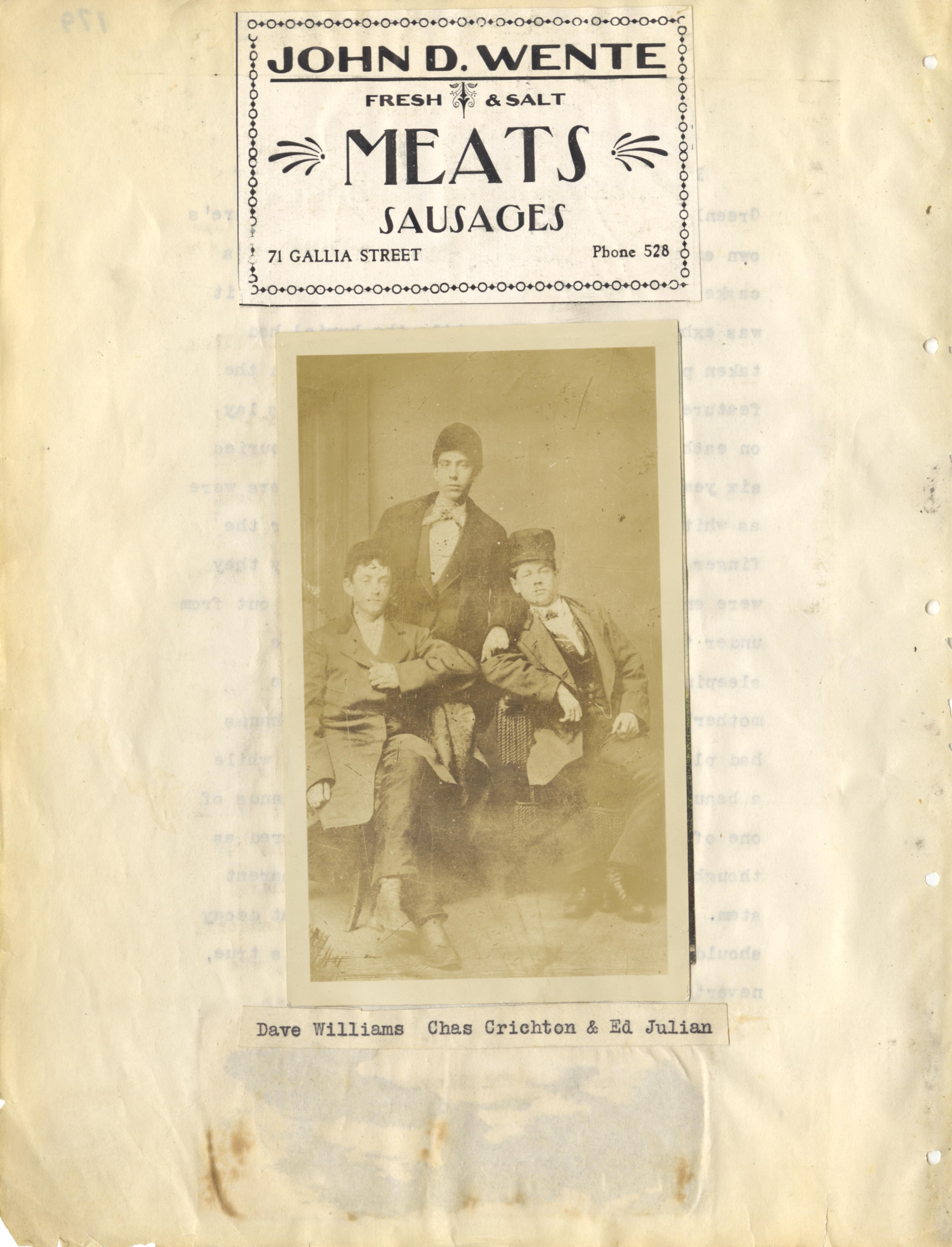 - Scanned scrapbook page. John S. Wente; Meats Sausages; Gallia Street; Dave Williams; Charles Crichton; Ed Julian