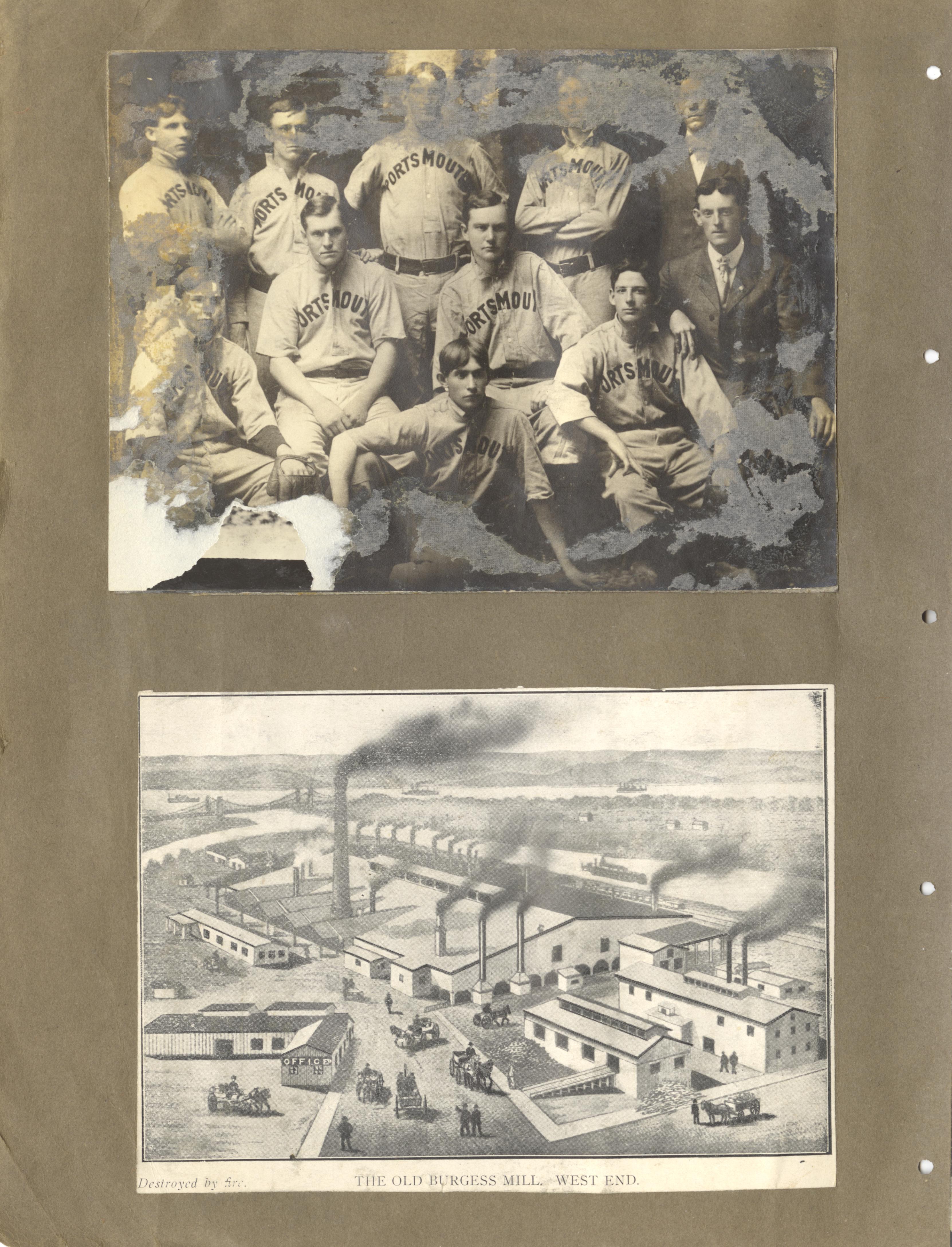 - Photo image of scanned scrapbook page. Portsmouth Baseball Uniforms; The Old Burgess Mill, West End