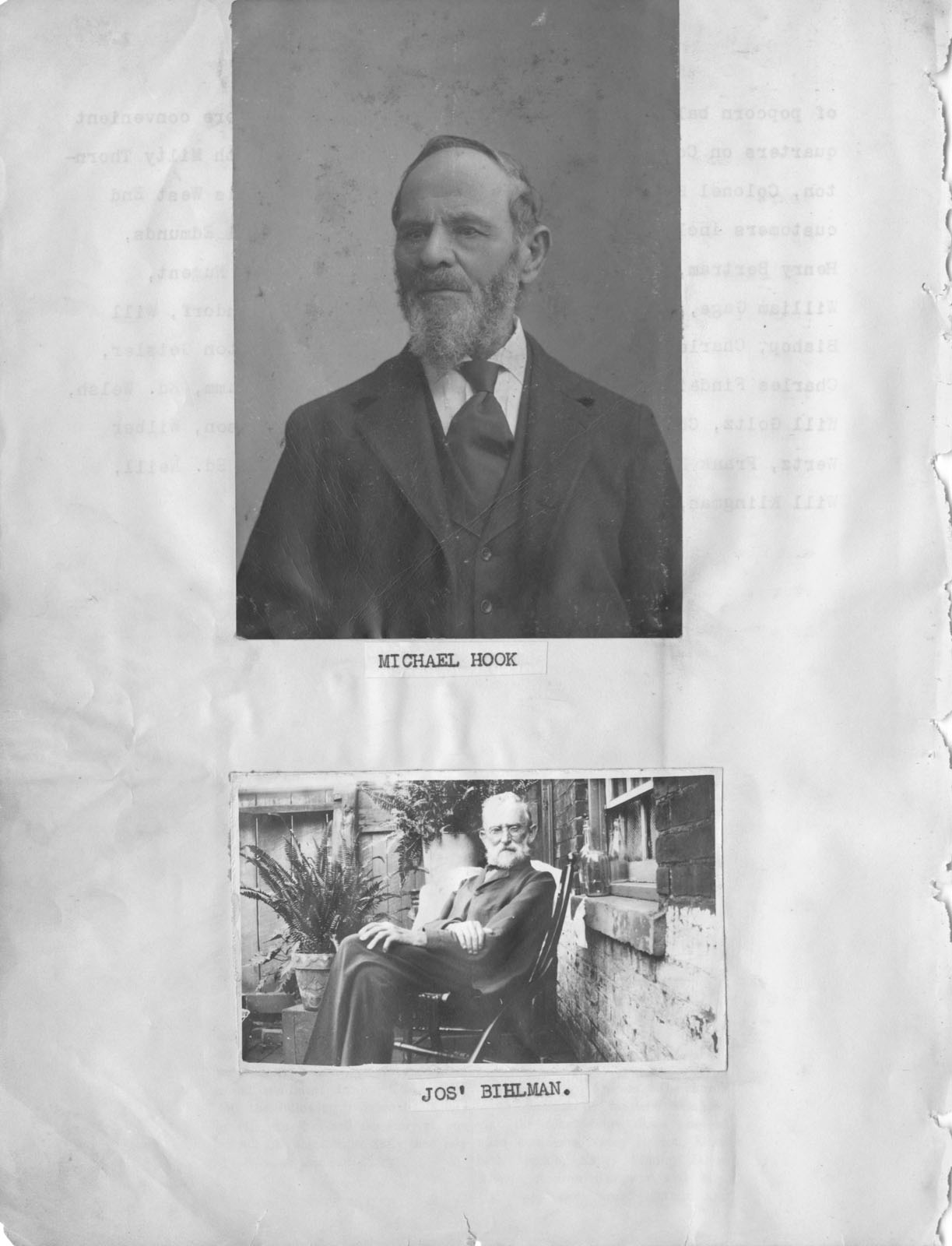 - Scanned unnumbered page from Henry A. Lorberg scrapbook containing black & white images of Michael Hook and Joseph Bihlman