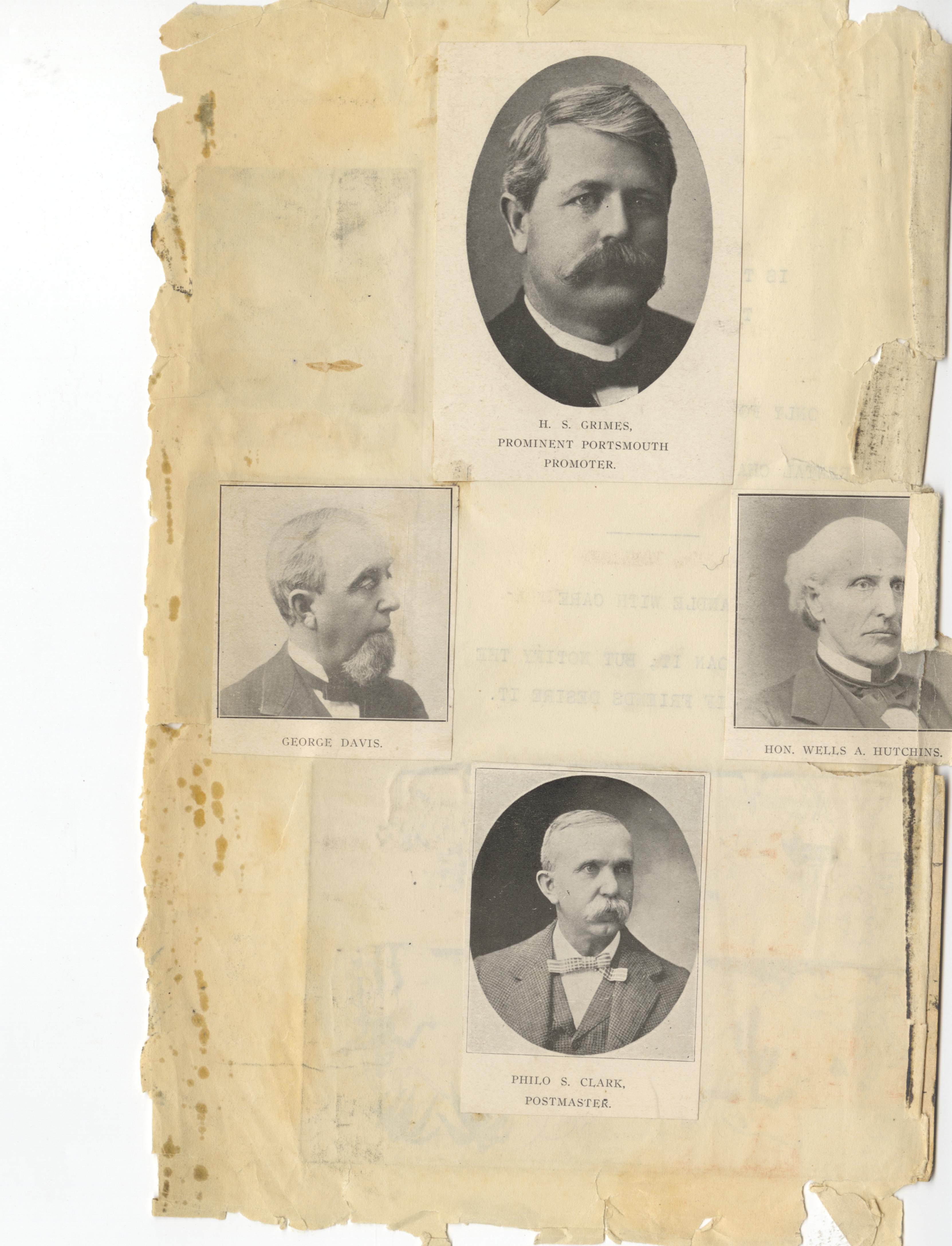 - Photo image of scanned scrapbook page. Shown are black and white images cut from Pictorial Portsmouth: H. S. Grimes; Prominent Portsmouth Promoter; George Davis; Honorable Wells A. Hutchins; Philo S. Clark; Postmaster.