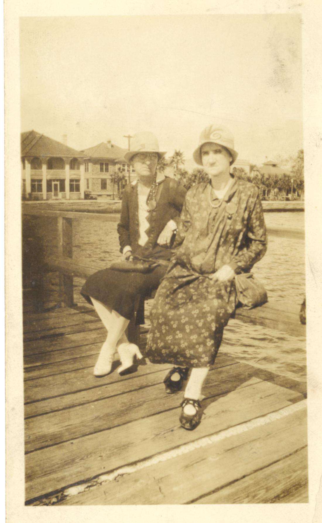 - Black and white photo of two ladies on a wooden structure by water. Written on back: "St. Augustine, Oct. 1928."