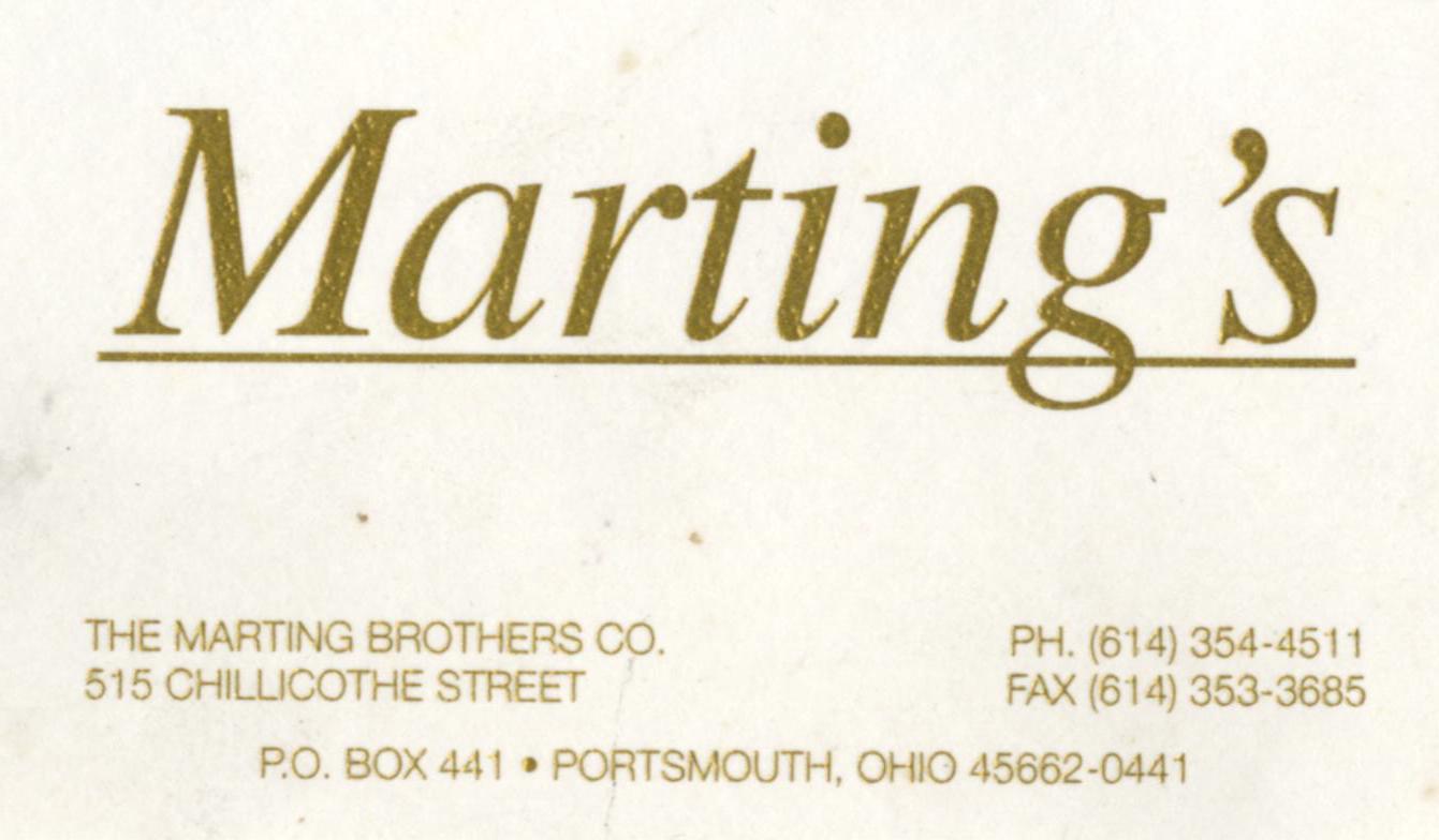 - Gold print on white cardstock business card: Marting's, The Marting Brothers Co., 515 Chillicothe Street, P.O. Box 441, Portsmouth, Ohio 45662-0441, PH. (614) 354-4511, FAX (614) 353-3685