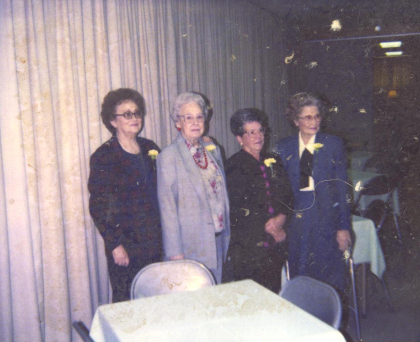 - Color instant photo of four unidentified ladies standing by a table for four covered by a white cloth, possibly at a banquet or similar event.
