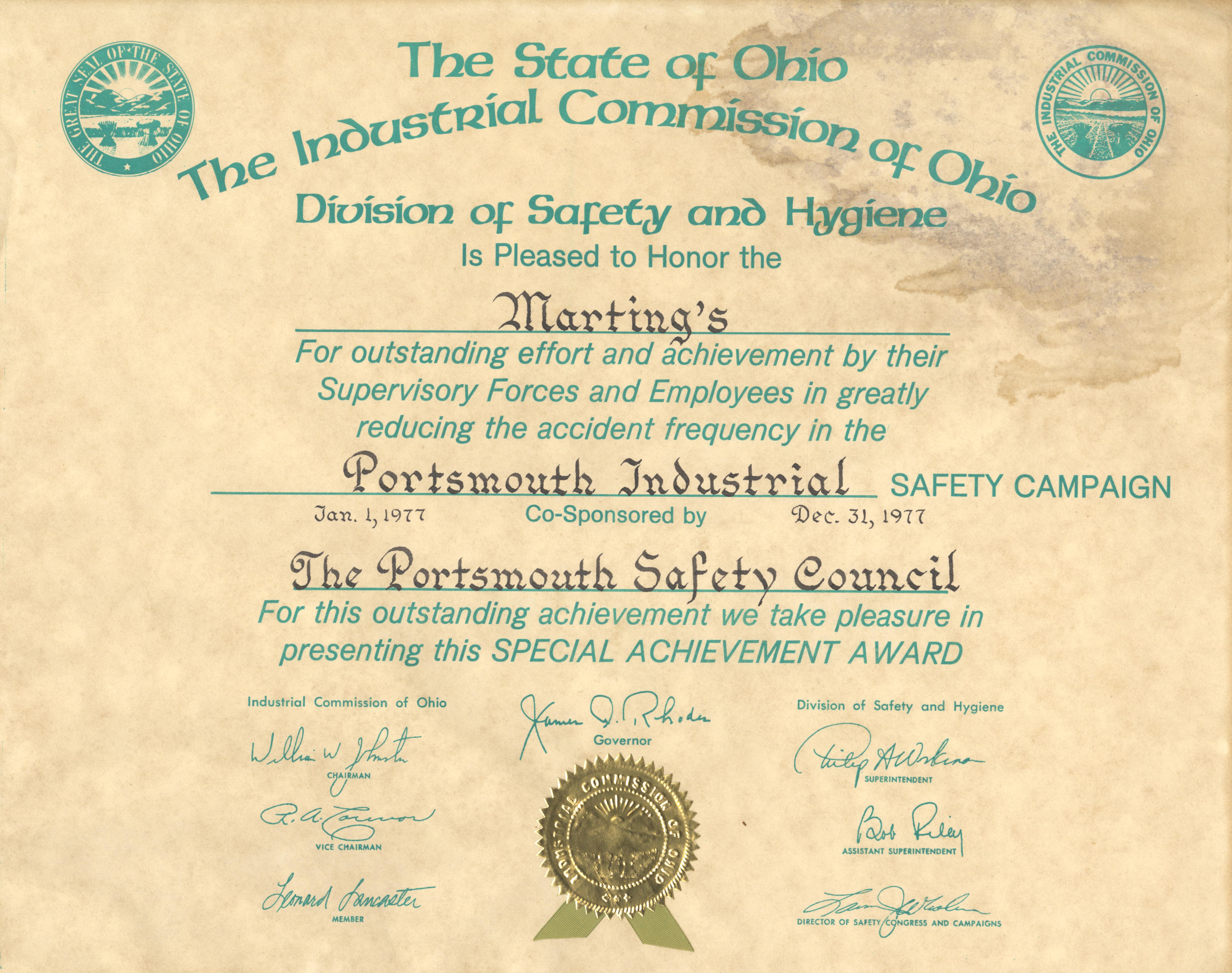 unknown, “Marting's Industrial Commission of Ohio certificate 1977,” Scioto County Public Library Local History Digital Collection, accessed December 15, 2025, https://www.sciotolibrary.org/history/items/show/24899.