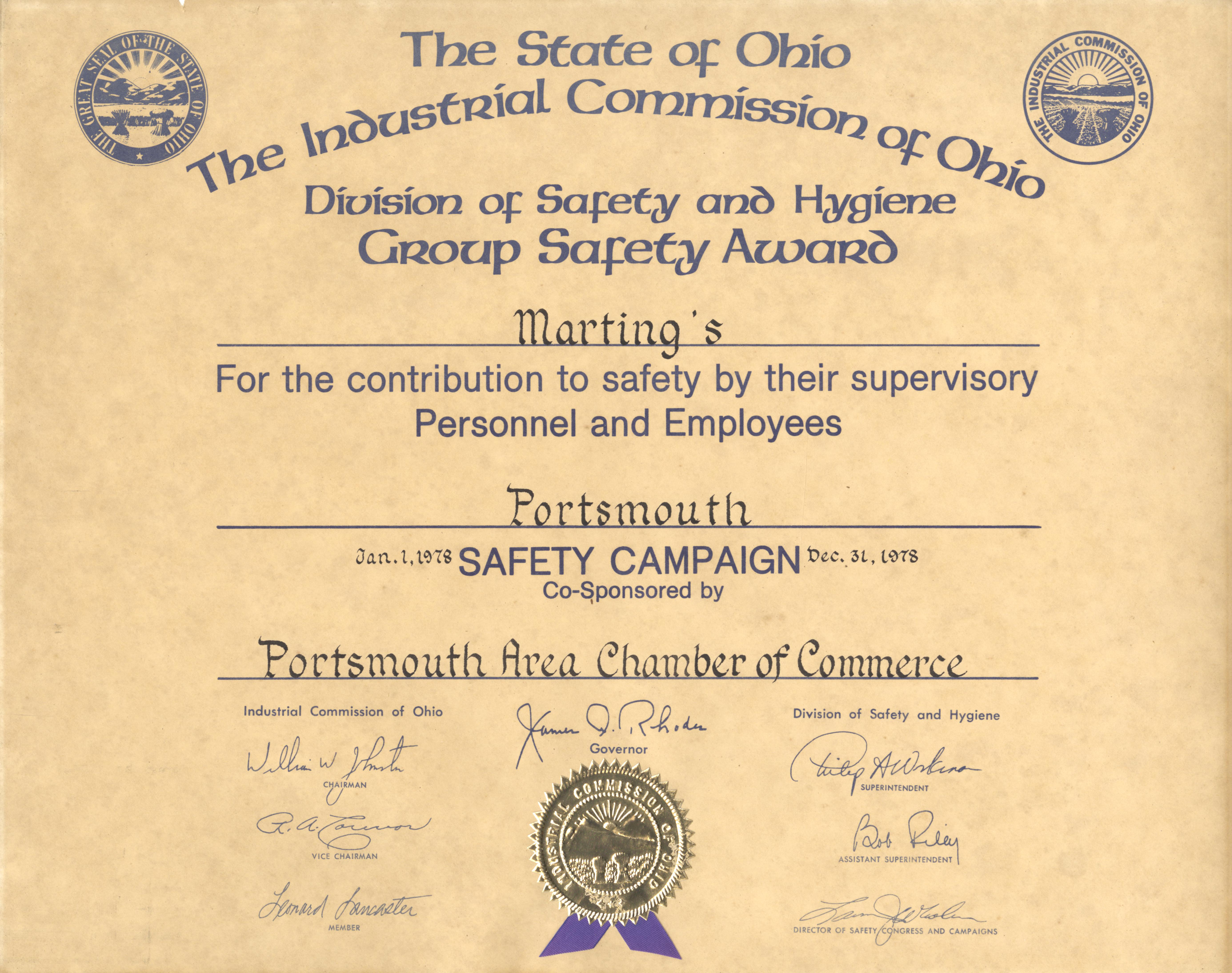 unknown, “Marting's Industrial Commission of Ohio certificate 1978,” Scioto County Public Library Local History Digital Collection, accessed December 14, 2025, https://www.sciotolibrary.org/history/items/show/24900.