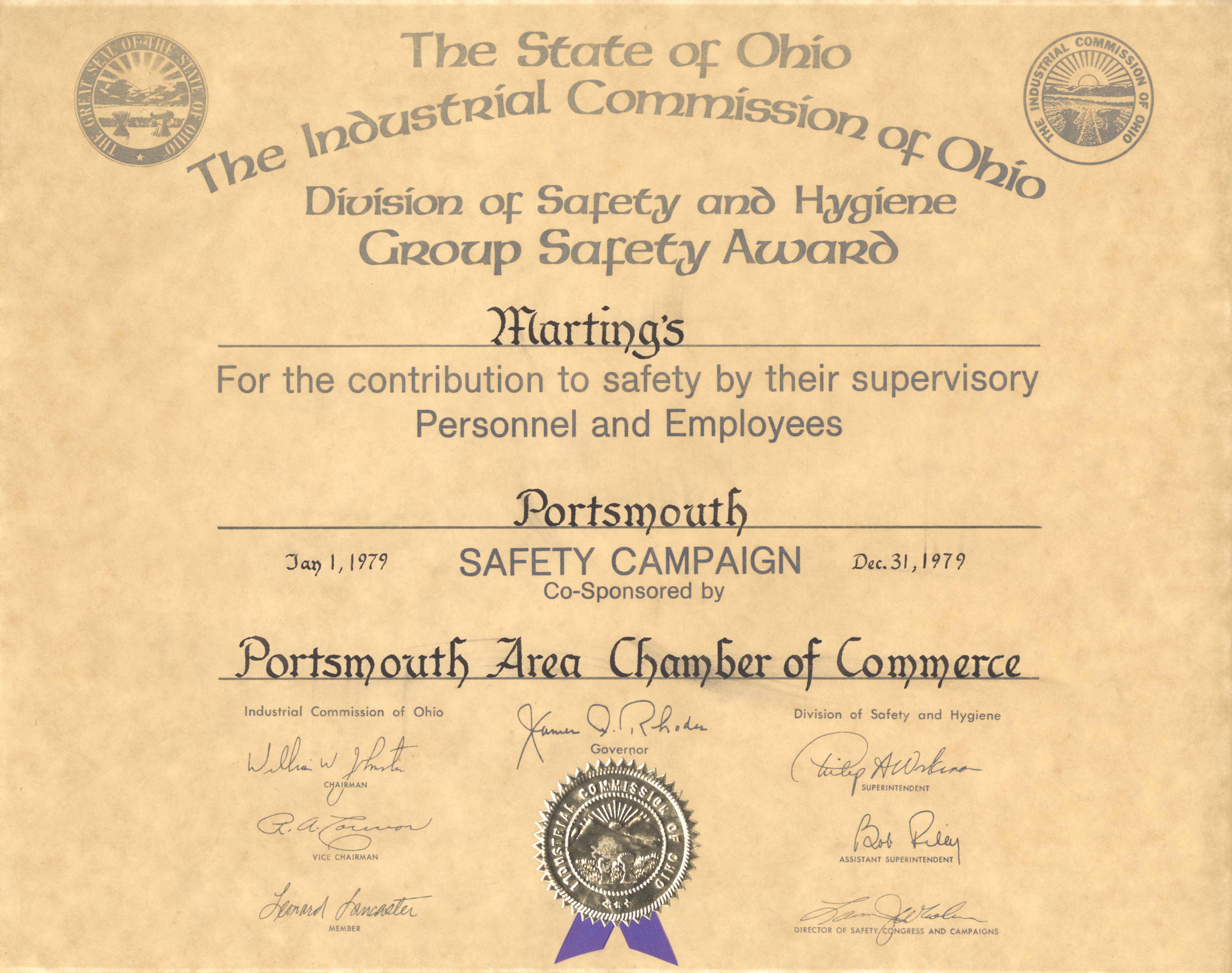 unknown, “Marting's Industrial Commission of Ohio certificate 1979,” Scioto County Public Library Local History Digital Collection, accessed December 14, 2025, https://www.sciotolibrary.org/history/items/show/24901.