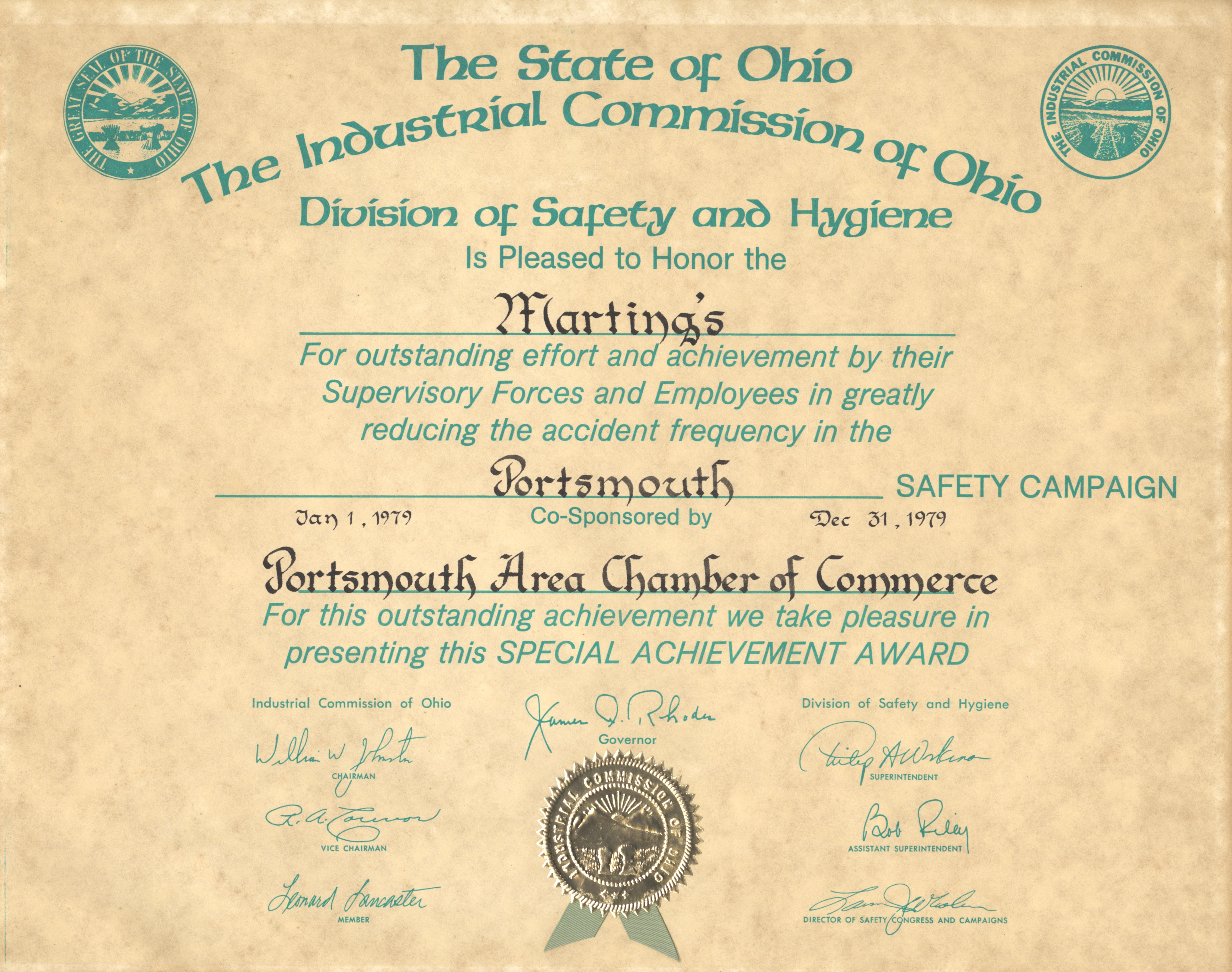 unknown, “Marting's Industrial Commission of Ohio certificate of Special Achievement award 1979,” Scioto County Public Library Local History Digital Collection, accessed December 14, 2025, https://www.sciotolibrary.org/history/items/show/24902.