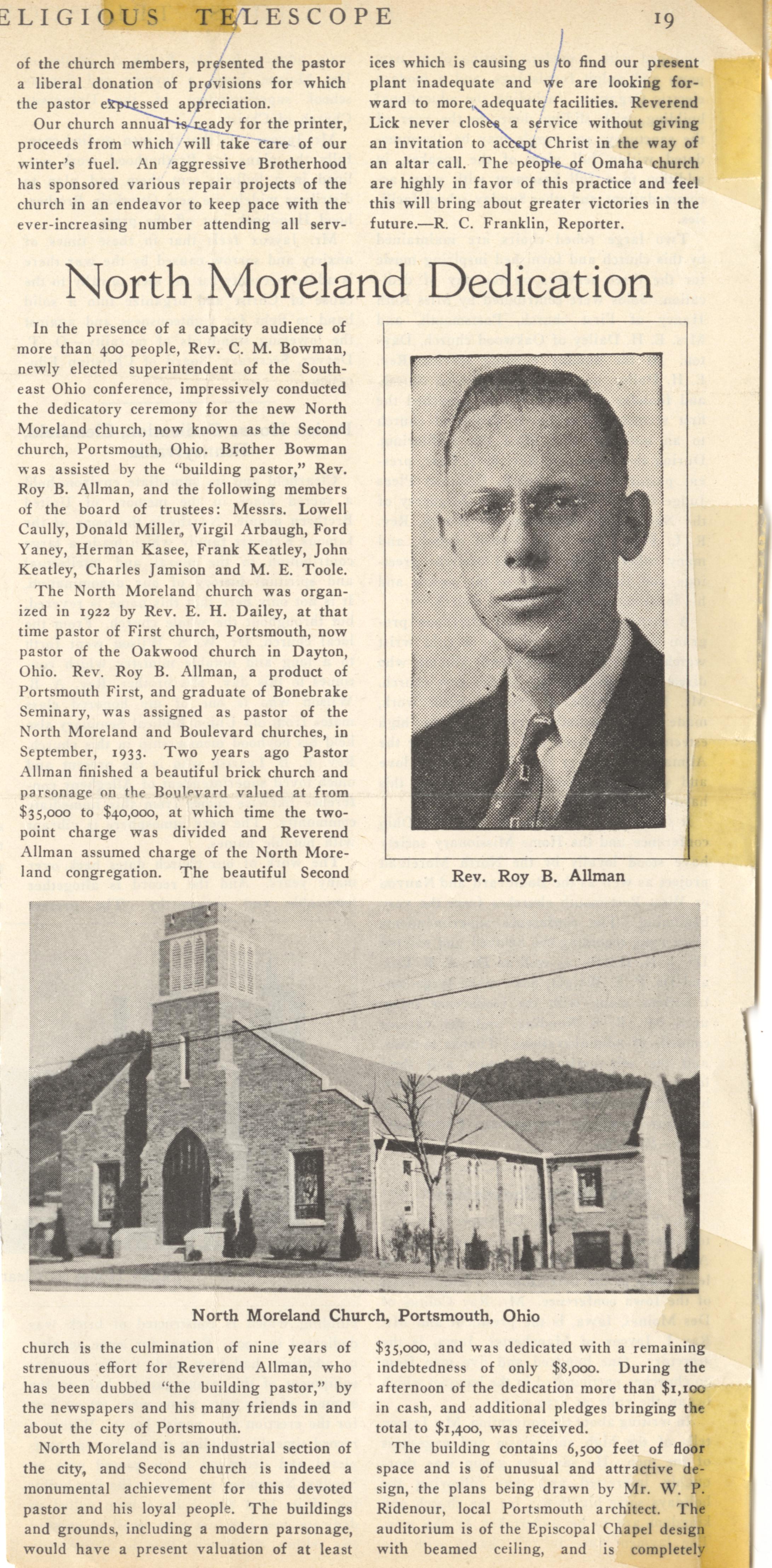 Reporter from Religious Telescope, “North Moreland Dedication for Rev. Roy B. Allman,” Scioto County Public Library Local History Digital Collection, accessed December 5, 2025, https://www.sciotolibrary.org/history/items/show/25091.