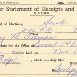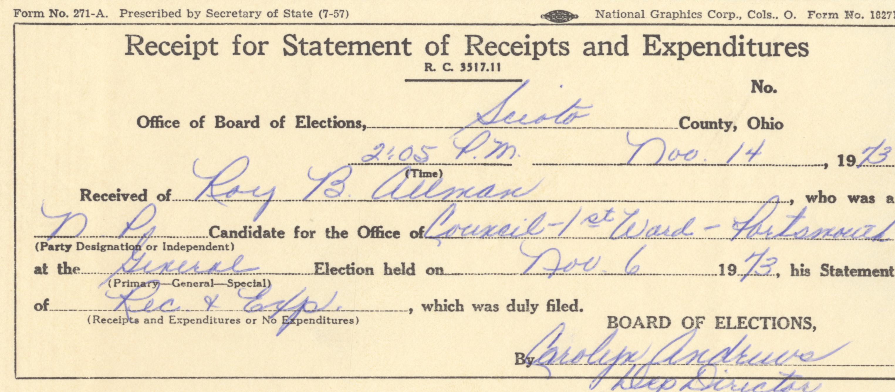 - A receipt for Roy B. Allman by the Board of Elections when he was a candidate for the office of Council- 1st Ward- Portsmouth in 1973. This receipt was signed by Carolyn Andrews who was the Dep. Director at that time.