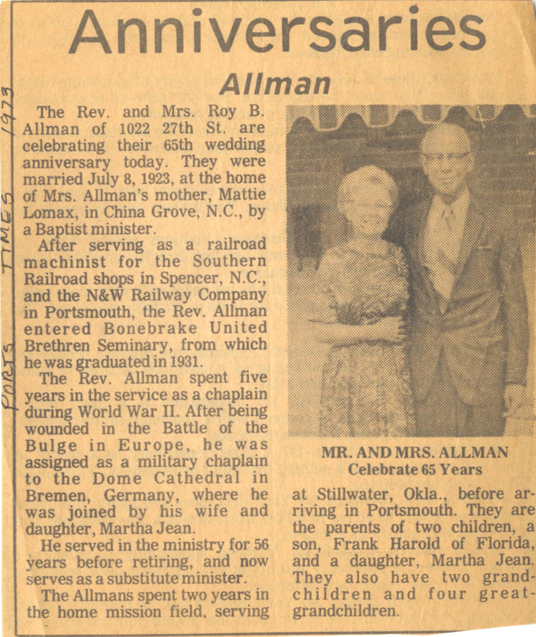 - A newspaper announcement for the 65th wedding anniversary of Rev. Roy B. Allman and Lottie Allman. Newspaper article gives a brief history on the couple.
