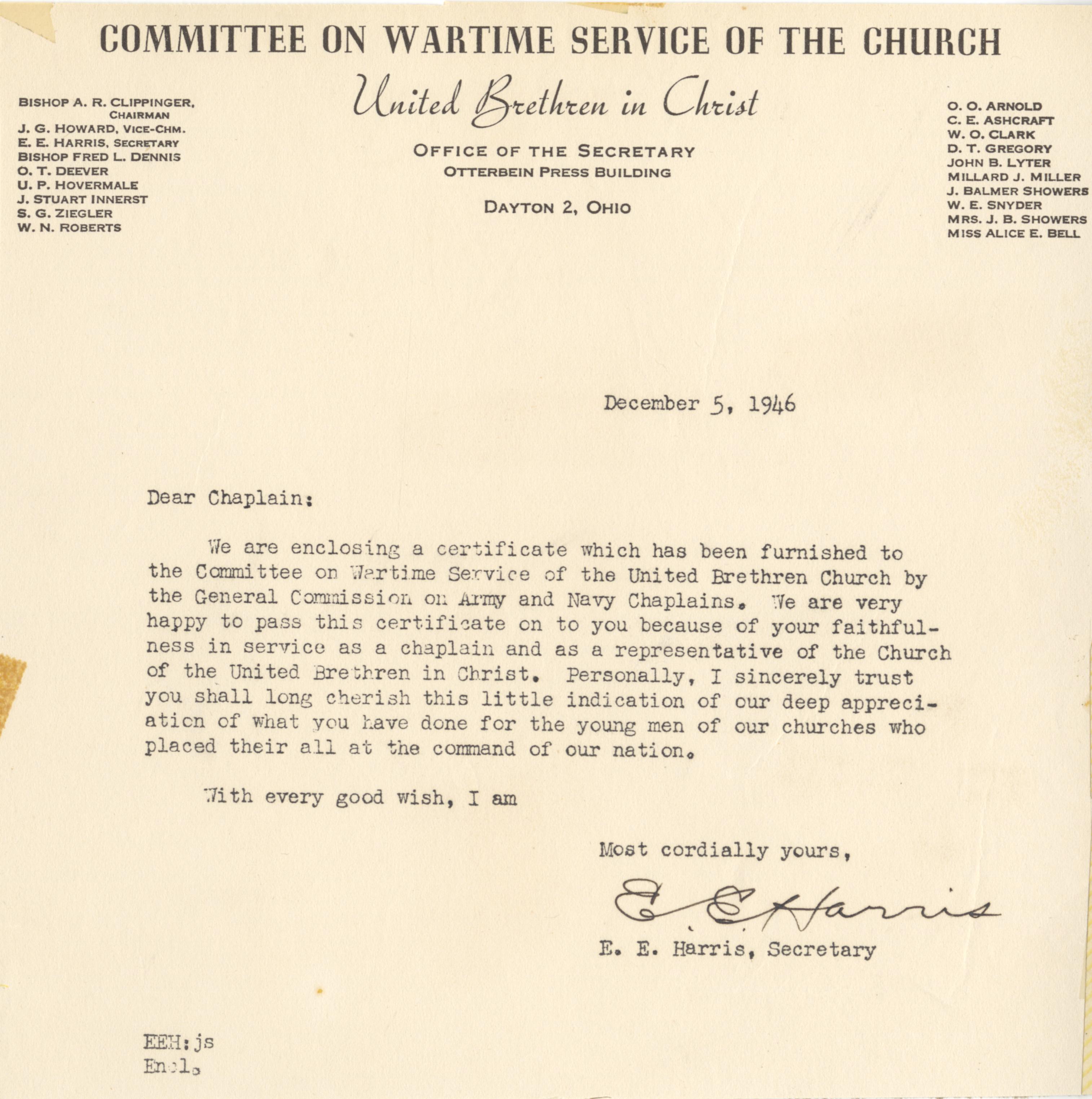 - Letter addressed to the Chaplain regarding a certificate to the Committee on Committee on Wartime Service of the Church United Brethren in Christ by the General Commission on Army and Navy Chaplains, with the date of December 5, 1946. This letter was signed by E.E. Harris. There are names and positions of individuals along the top sides of this letter.