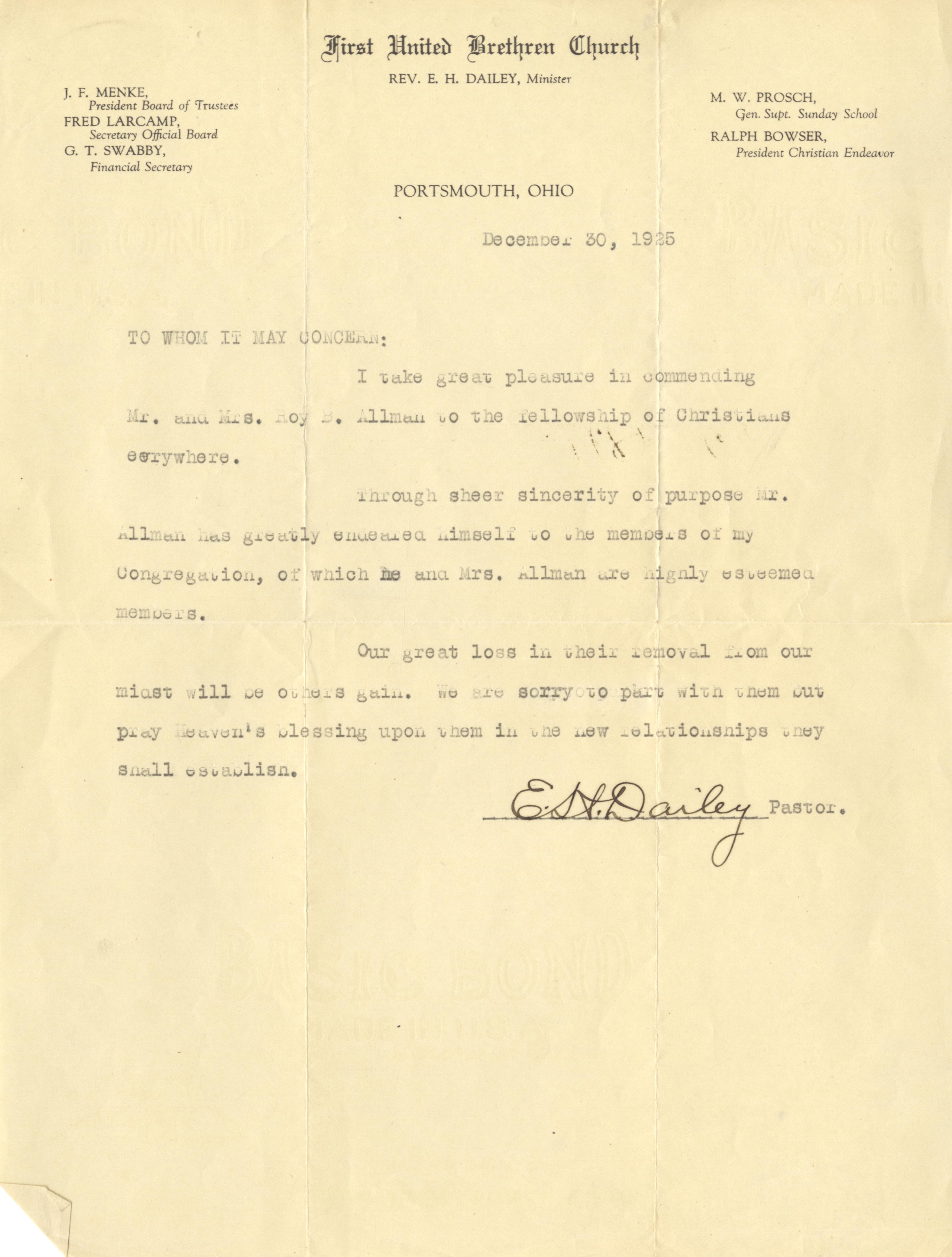 - A letter wrote by Rev. E.H. Dailey on December 30, 1925 commending Mr. and Mrs. Roy B. Allman to the fellowship of Christians everywhere.