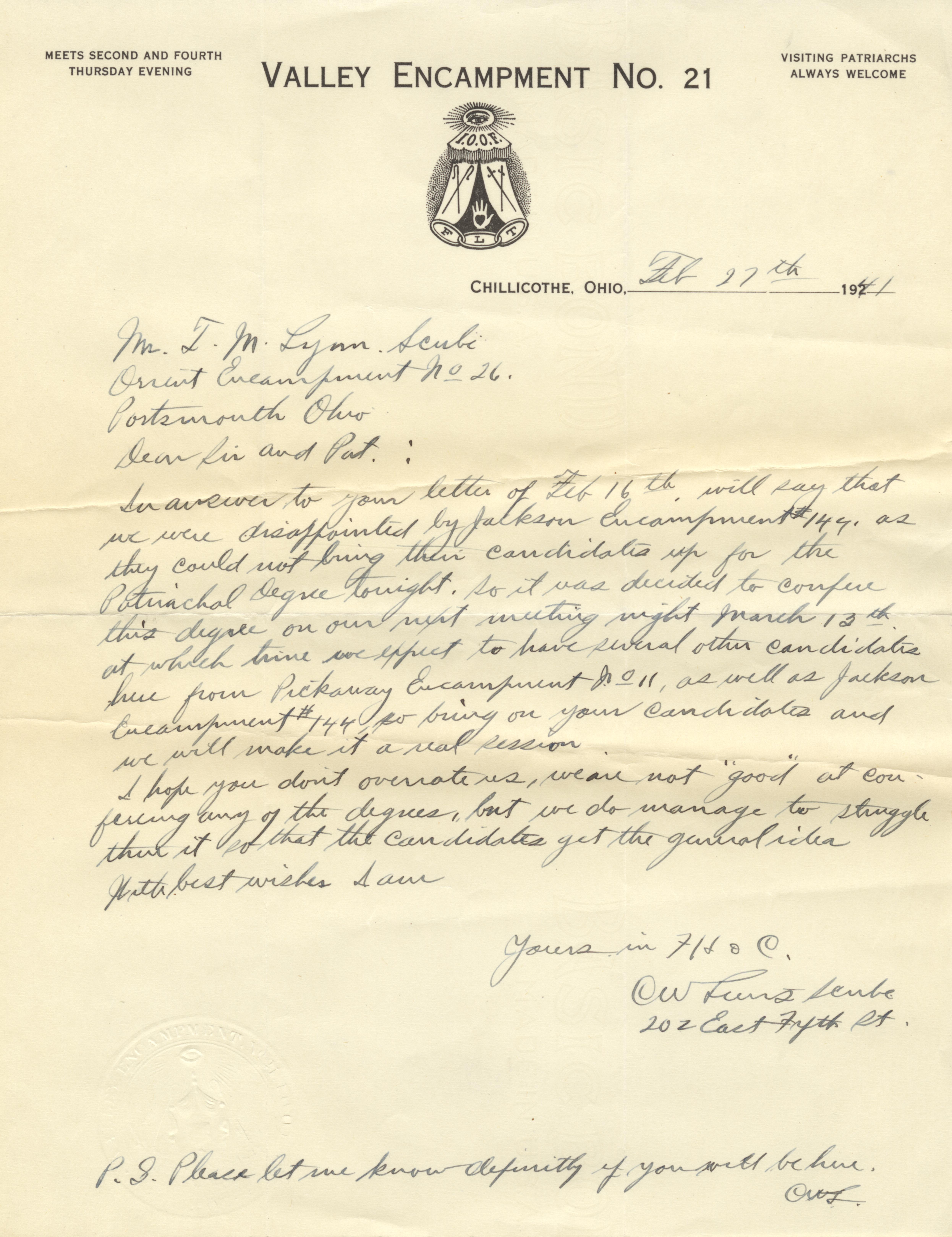 - Photo image of an Independent Order of Odd Fellows letter to T. M. Lynn, Scribe of the Orient Encampment No .26. Letter is from the Valley Encampment No. 21 of Chillicothe, Ohio