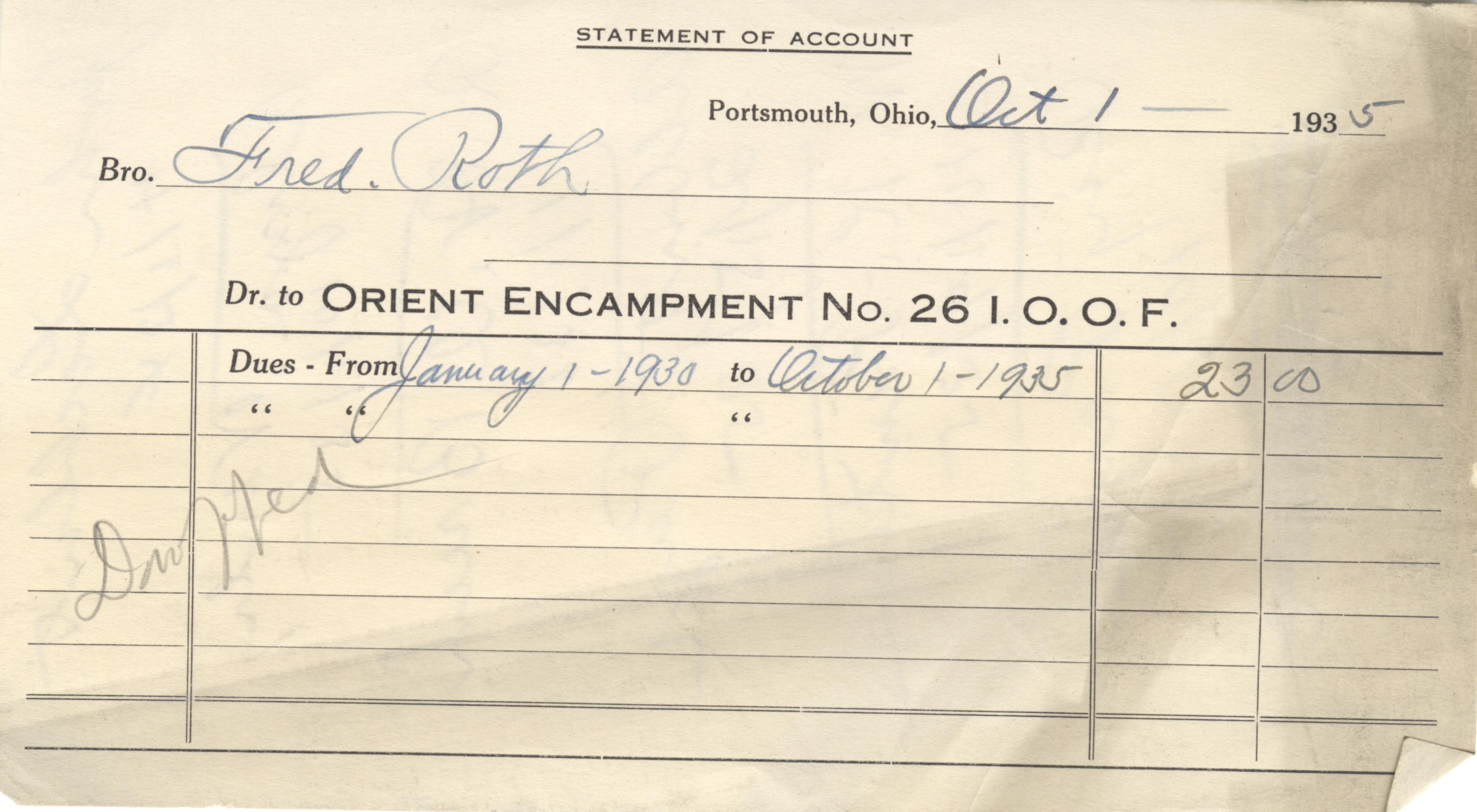 I.O.O.F., “Independent Order of Odd Fellows Receipt for Fred Roth,” Scioto County Public Library Local History Digital Collection, accessed December 6, 2025, https://www.sciotolibrary.org/history/items/show/25176.