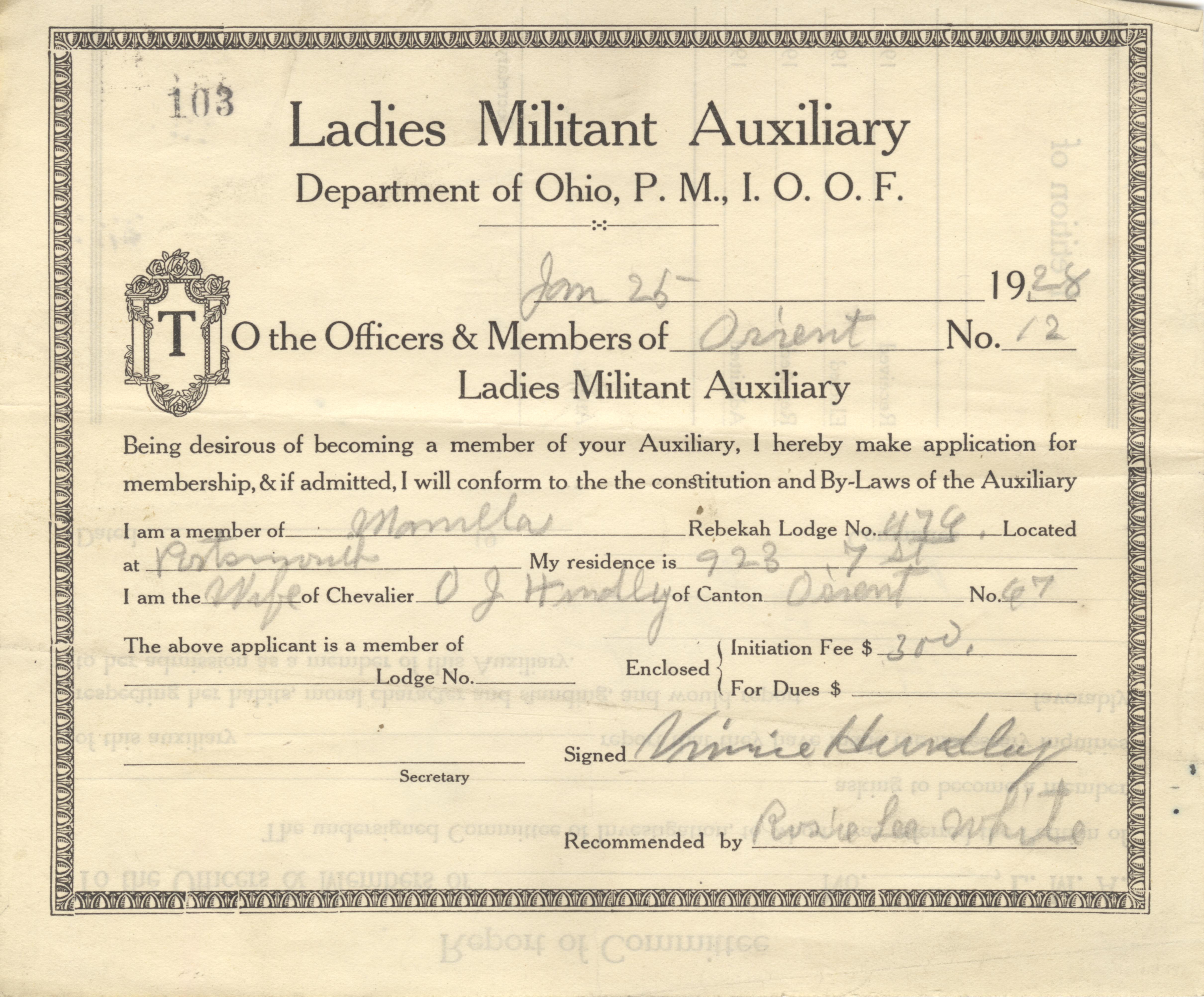 I. O. O. F. , “Independent Order of Odd Fellows Ladies Militant Auxiliary Membership Application Form,” Scioto County Public Library Local History Digital Collection, accessed December 6, 2025, https://www.sciotolibrary.org/history/items/show/25185.