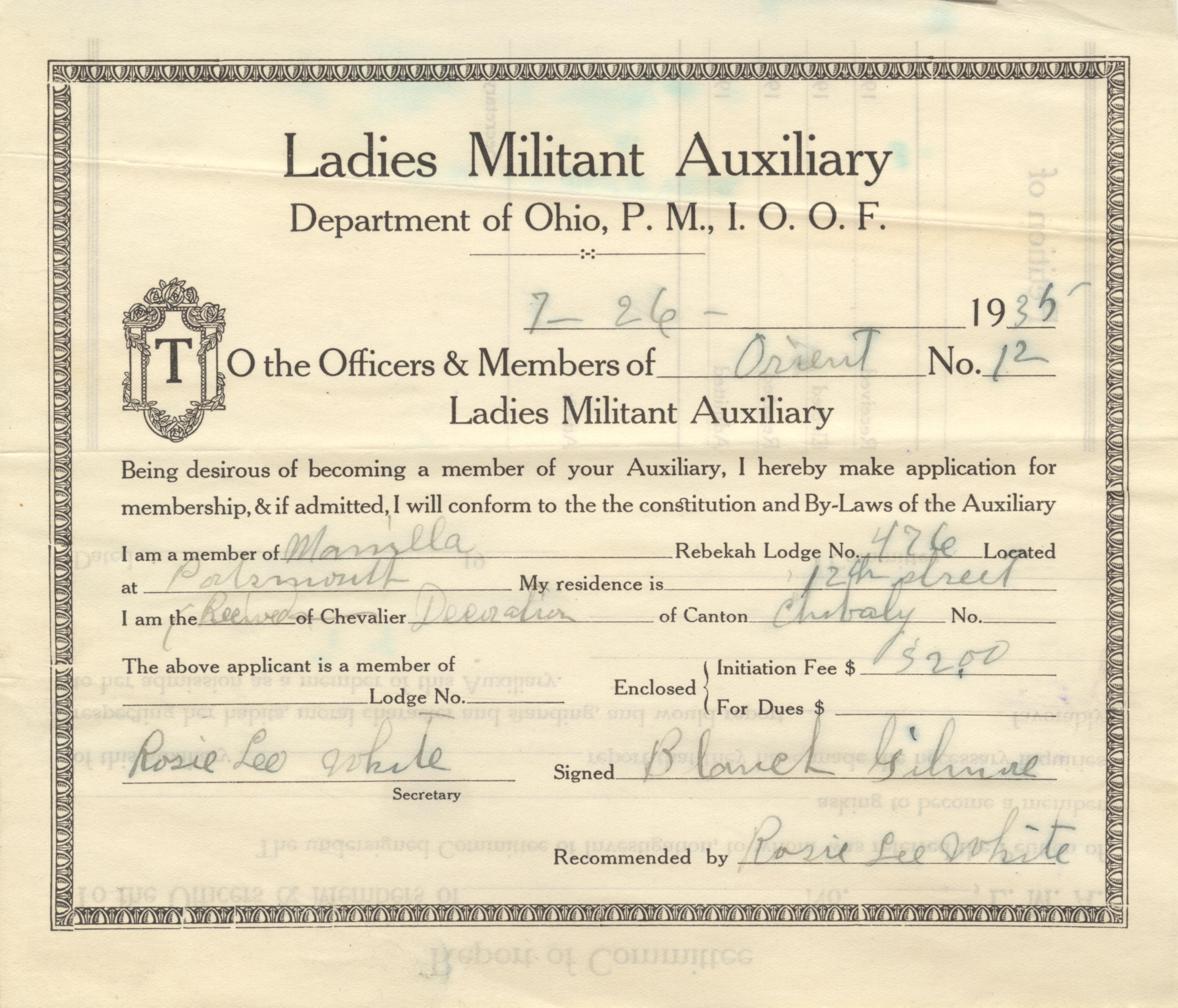 I. O. O. F. , “Independent Order of Odd Fellows Ladies Militant Auxiliary Membership Application Form,” Scioto County Public Library Local History Digital Collection, accessed December 6, 2025, https://www.sciotolibrary.org/history/items/show/25187.