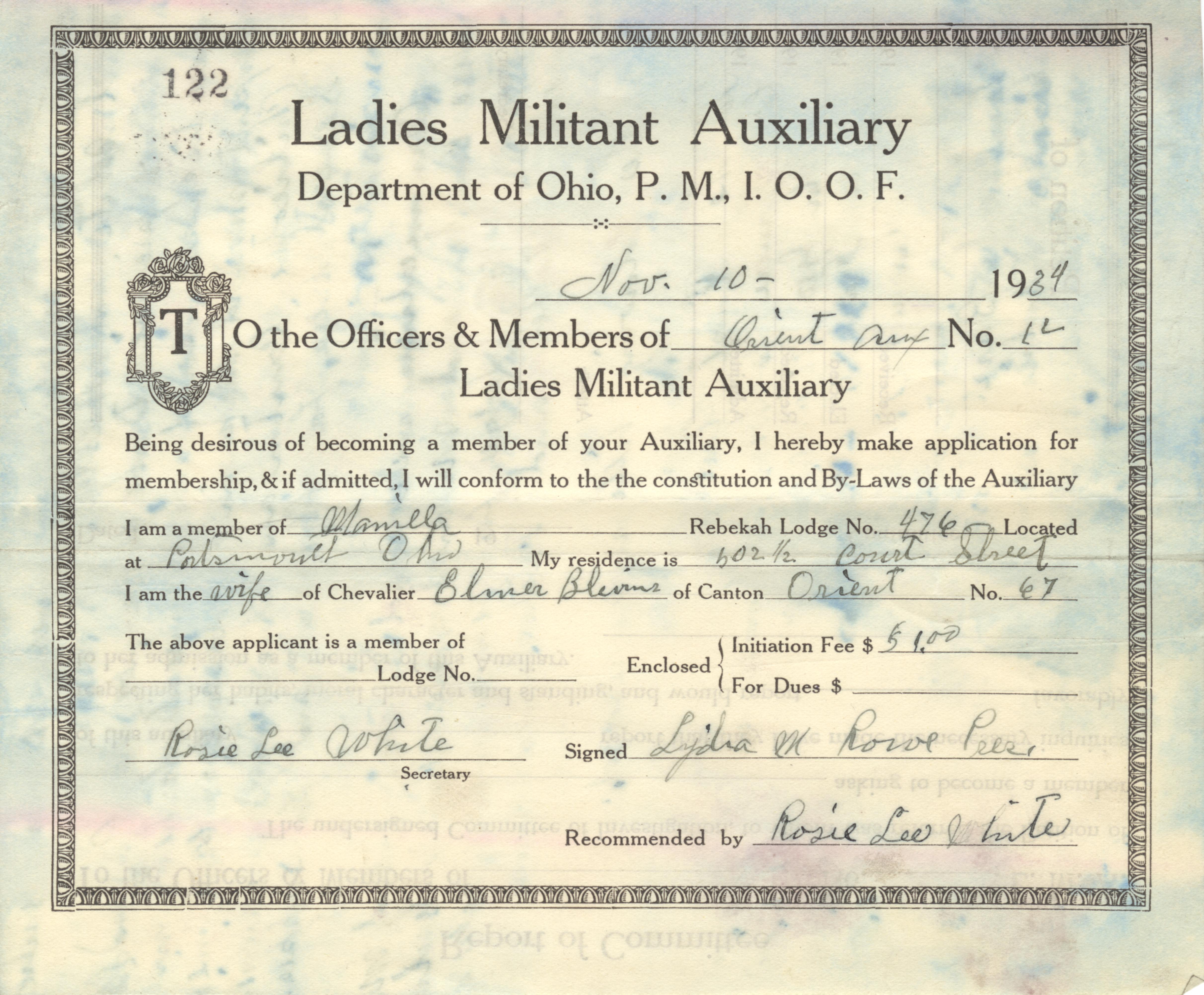 I. O. O. F. , “Independent Order of Odd Fellows Ladies Militant Auxiliary Membership Application Form,” Scioto County Public Library Local History Digital Collection, accessed December 8, 2025, https://www.sciotolibrary.org/history/items/show/25189.