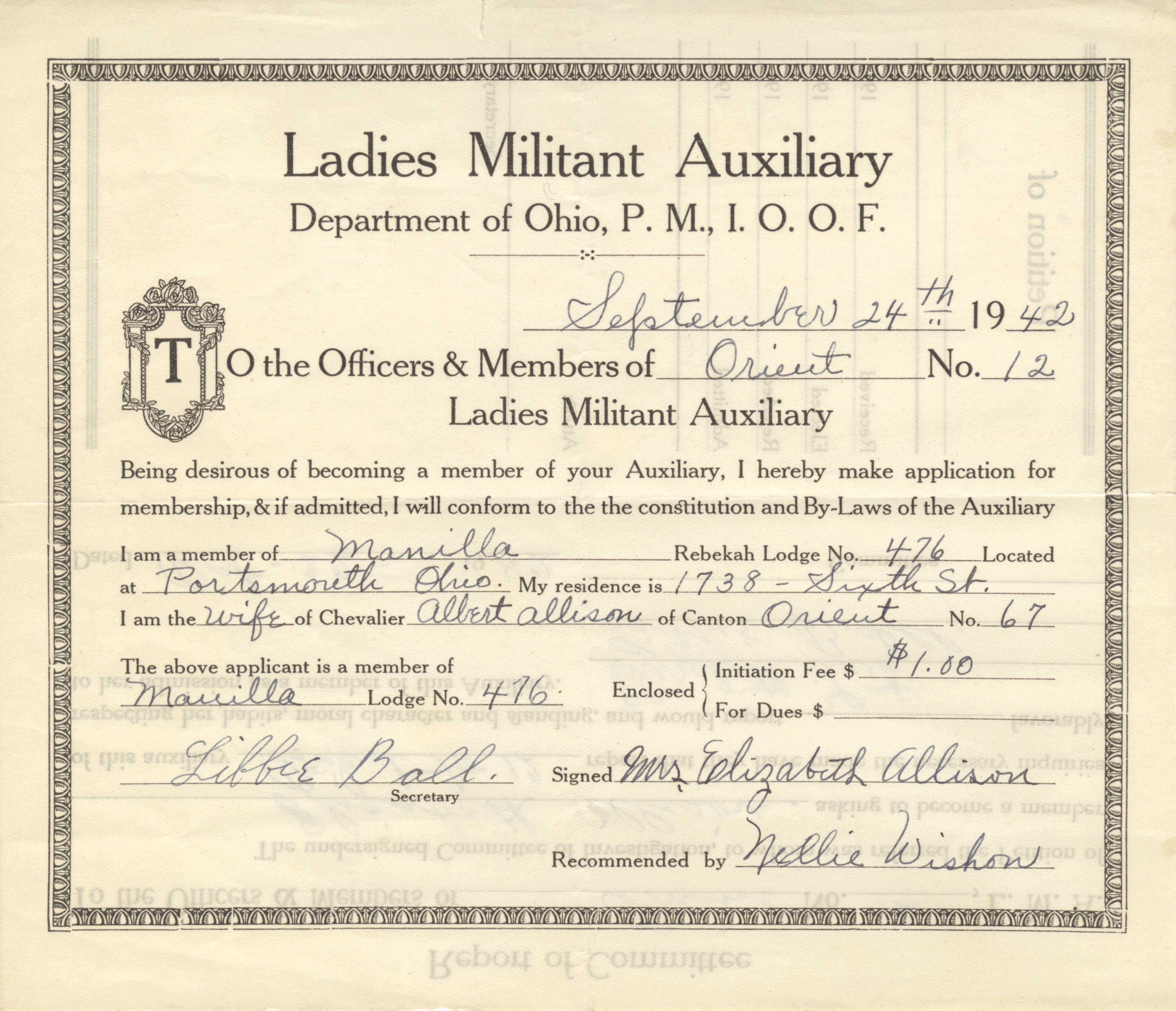 - Photo image of the Independent Order of Odd Fellows Ladies Militant Auxiliary Membership Application Form for Elizabeth Allison.