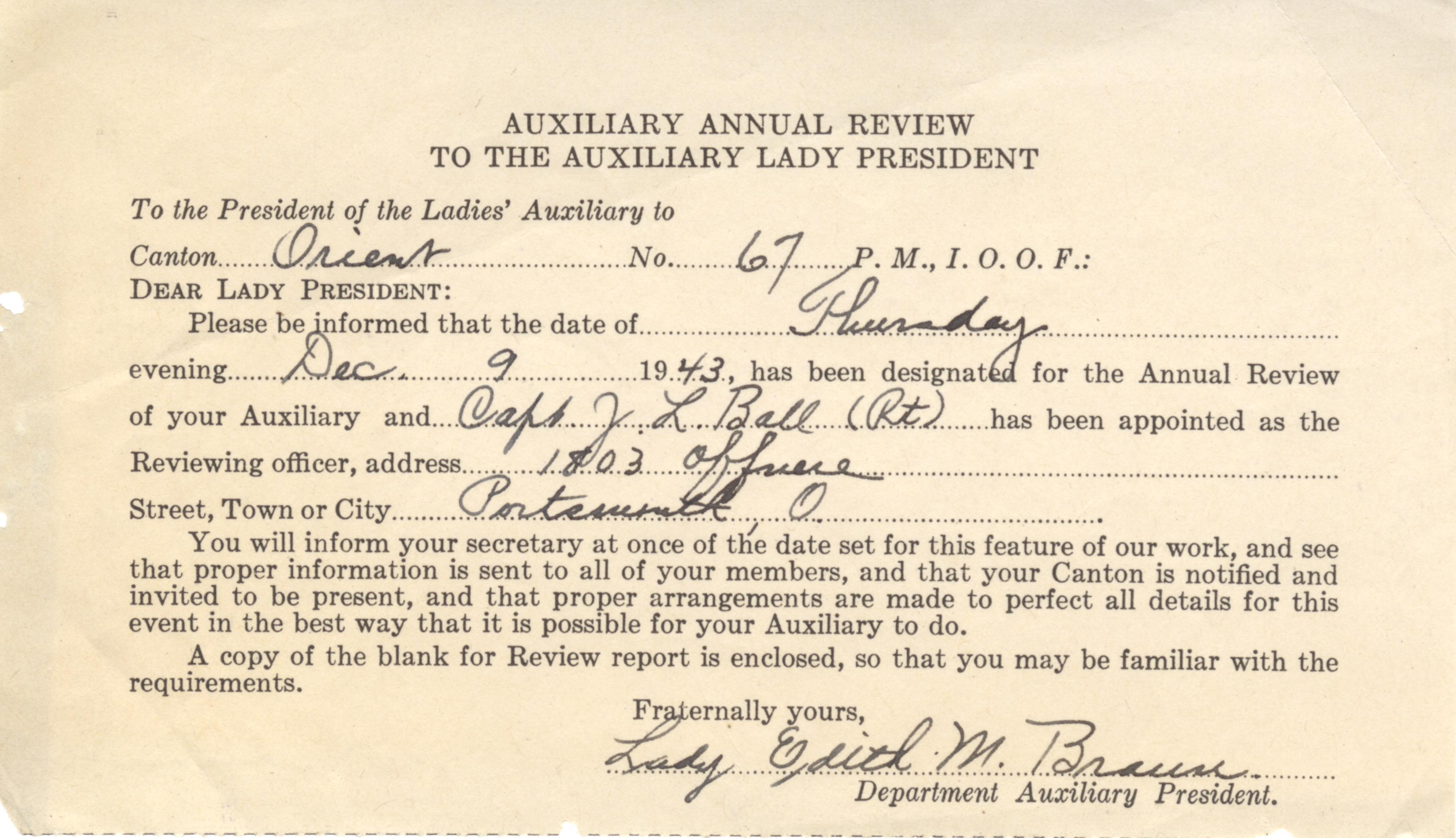 - Photo image of the Independent Order of Odd fellows Auxiliary annual Review to the Auxiliary Lady President for the Orient Encampment No. 67. Listed as the reviewer: Captain J. L. Ball.
