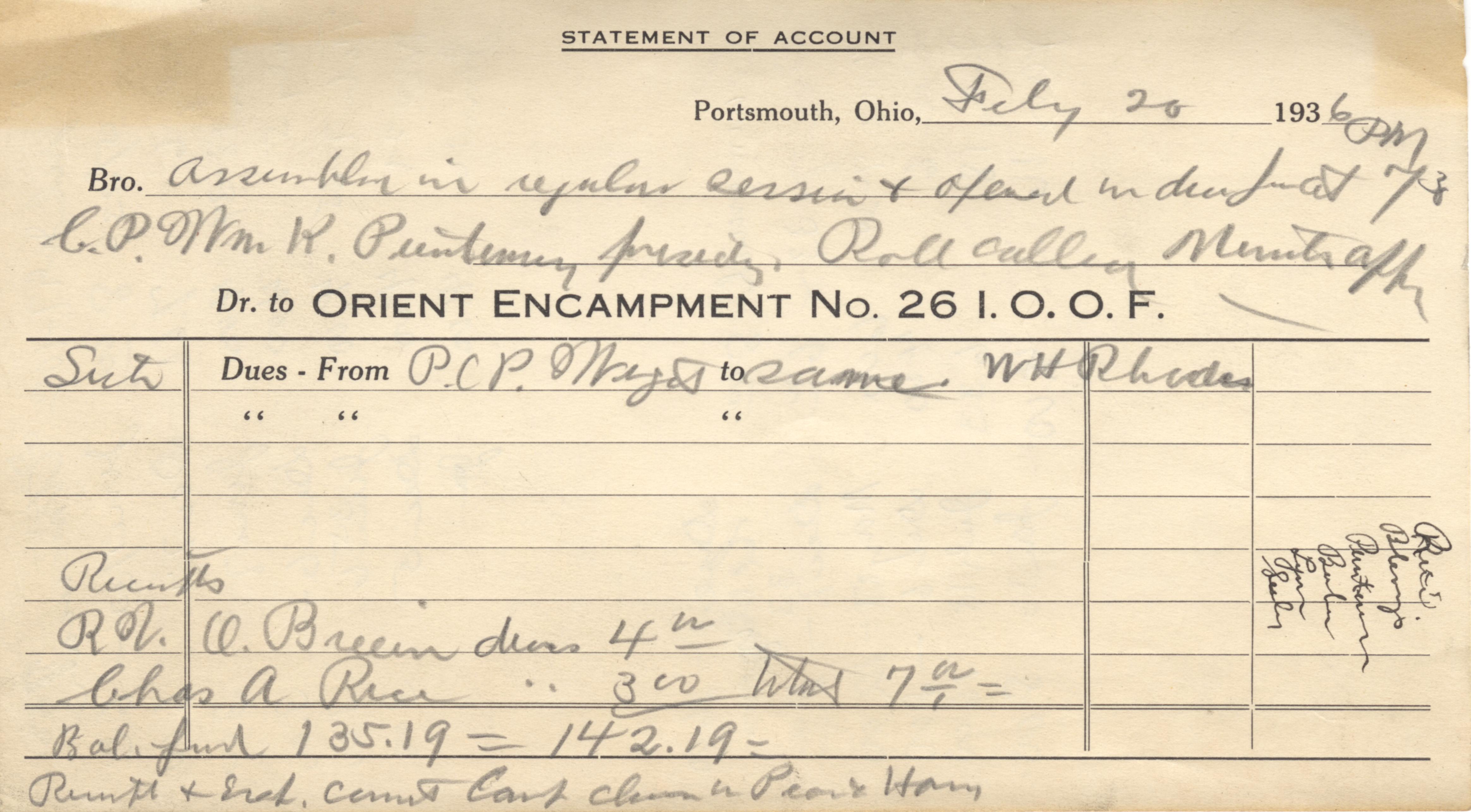 I. O. O. F. , “Independent Order of Odd Fellows Statement of Account, Orient Encampment No. 26,” Scioto County Public Library Local History Digital Collection, accessed December 5, 2025, https://www.sciotolibrary.org/history/items/show/25196.