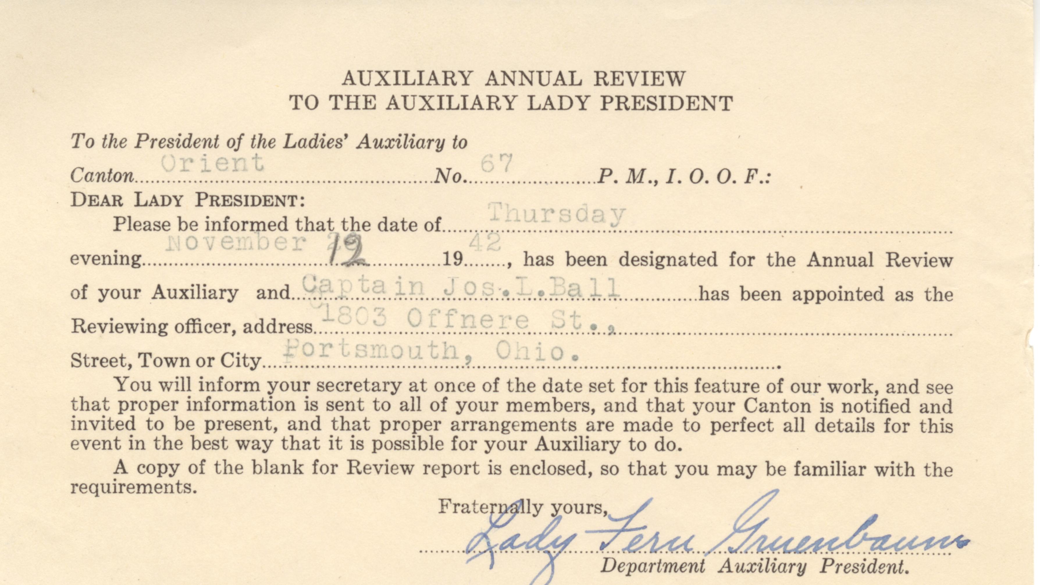 - Independent Order of Odd Fellows Auxiliary Annual Review to the Auxiliary Lady President
