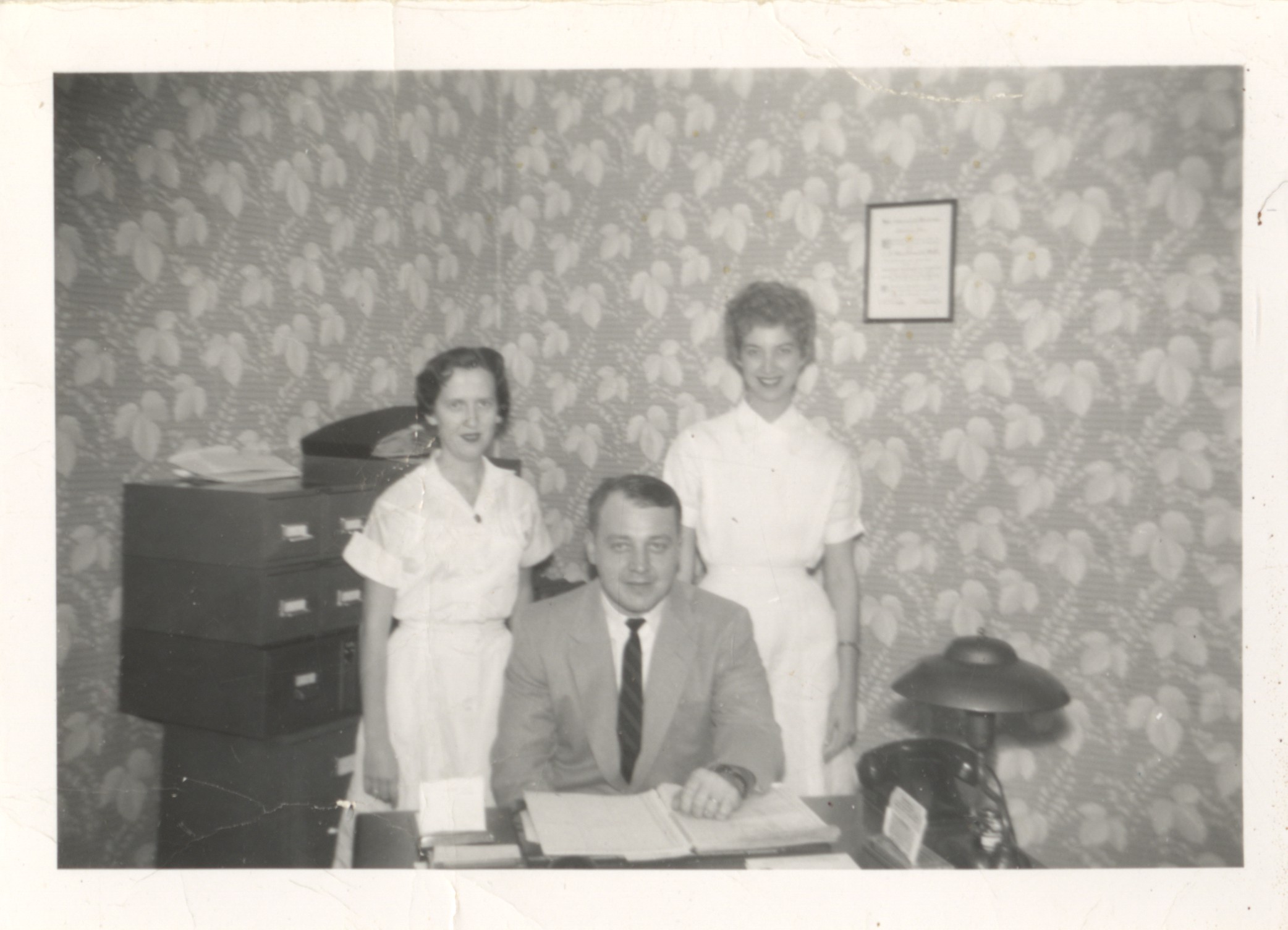 - Black and white photo image of Doctor McDonald and nurses, one named Mary Boyd.